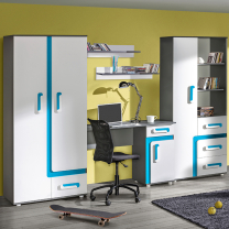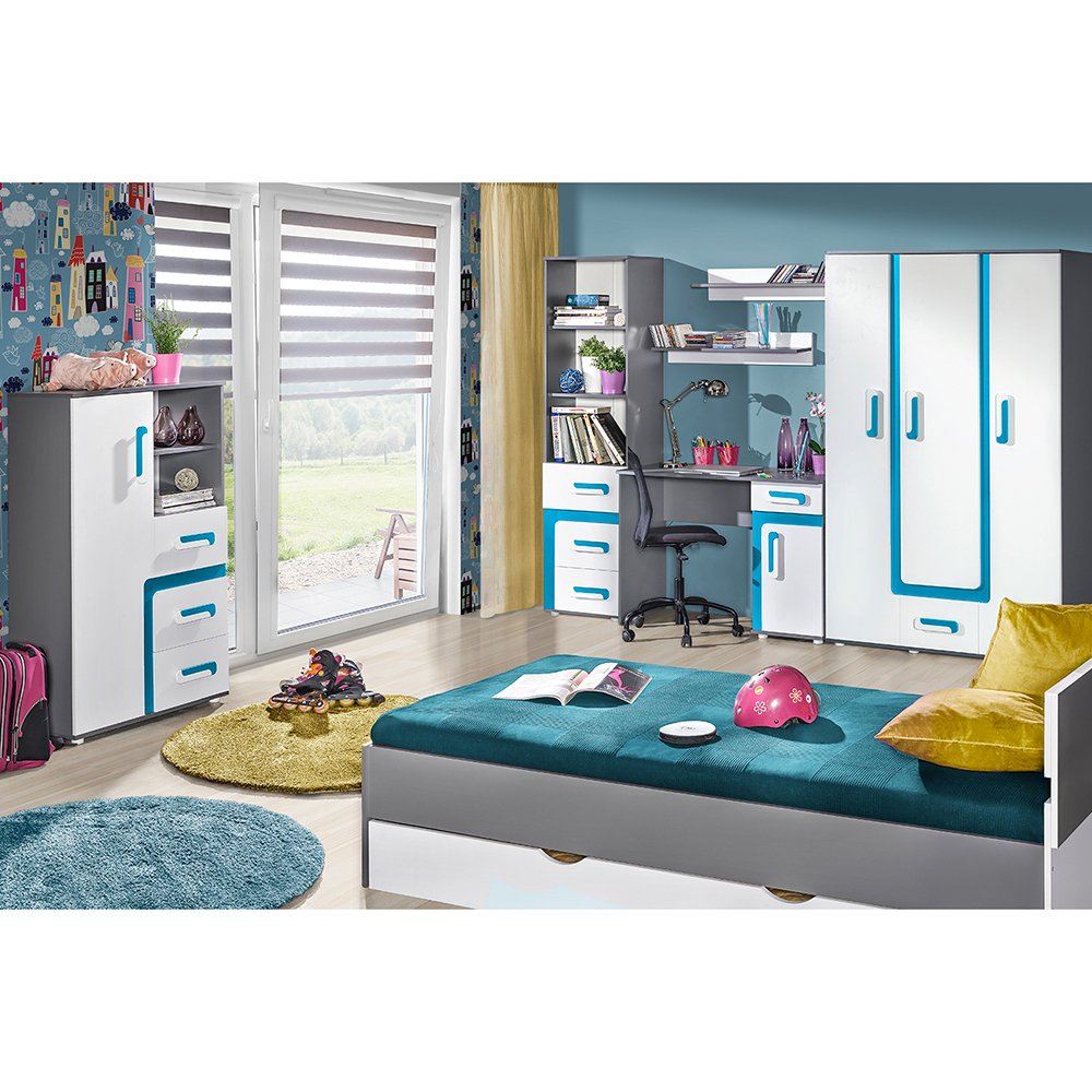 Komoda Apetito 8 - Hledáte dětský pokojíček v modrém odstínu? Apetito v barevné kombinaci antracit/bílá/tyrkys bude pro Vás tou pravou volbou. Tato barevná kombinace osvěží a prosvětlí i menší pokojíky. Kombinace je neutrální. Ani po letech se neokouká a nábytek tak poslouží dětem předškolního věku i studentům. Dětský pokoj Apetito nabízíme i v dalších barevných kombinacích. Pokojíček si můžete objednat již v předdefinovaných sestavách i po jednotlivých dílech. Snadno si tak sestavíte pokojíček podle svých představ a možností. Nábytek je vyroben z kvalitní laminátové dřevotřísky o síle 16 mm s ochrannou ABS hranou. Záda tvoří HDF desky. Zásuvky jsou opatřeny ložiskovými pojezdy, které zajistí hladký posun. Zboží Vám dodáme v demontu s podrobným návodem na sestavení a kováním.
