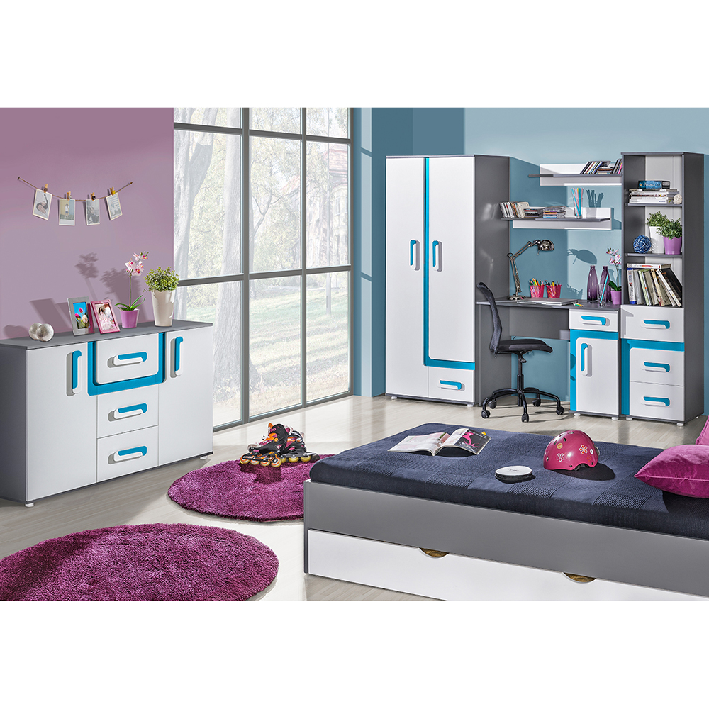 Regál Apetito 5 - Hledáte dětský pokojíček v modrém odstínu? Apetito v barevné kombinaci antracit/bílá/tyrkys bude pro Vás tou pravou volbou. Tato barevná kombinace osvěží a prosvětlí i menší pokojíky. Kombinace je neutrální. Ani po letech se neokouká a nábytek tak poslouží dětem předškolního věku i studentům. Dětský pokoj Apetito nabízíme i v dalších barevných kombinacích. Pokojíček si můžete objednat již v předdefinovaných sestavách i po jednotlivých dílech. Snadno si tak sestavíte pokojíček podle svých představ a možností. Nábytek je vyroben z kvalitní laminátové dřevotřísky o síle 16 mm s ochrannou ABS hranou. Záda tvoří HDF desky. Zásuvky jsou opatřeny ložiskovými pojezdy, které zajistí hladký posun. Zboží Vám dodáme v demontu s podrobným návodem na sestavení a kováním.