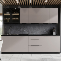 Arona přináší nejmodernější design s jednoduchými liniemi a esteticky příjemnou barevnou kombinací. Dvířka v elegantním odstínu kašmír kontrastují s černým vnějším korpusem, zatímco bílý interiér skříněk zajišťuje lepší přehlednost a snadnou orientaci v čistotě Vaší kuchyně.
