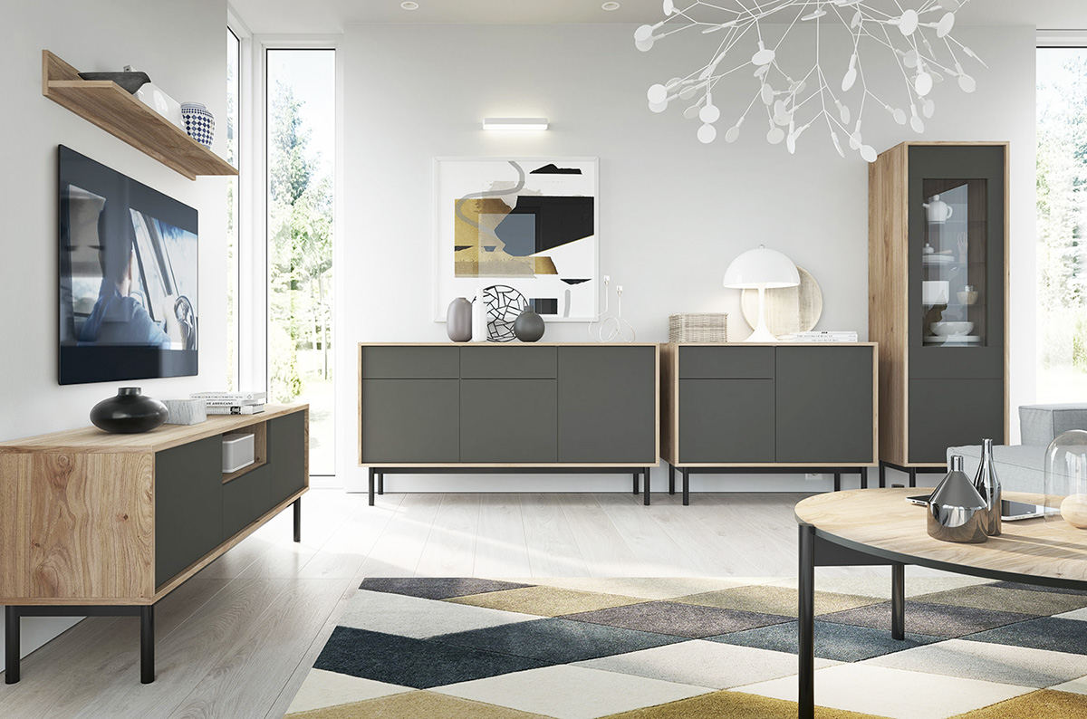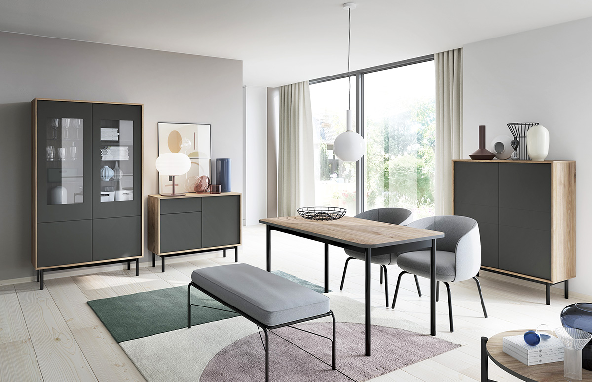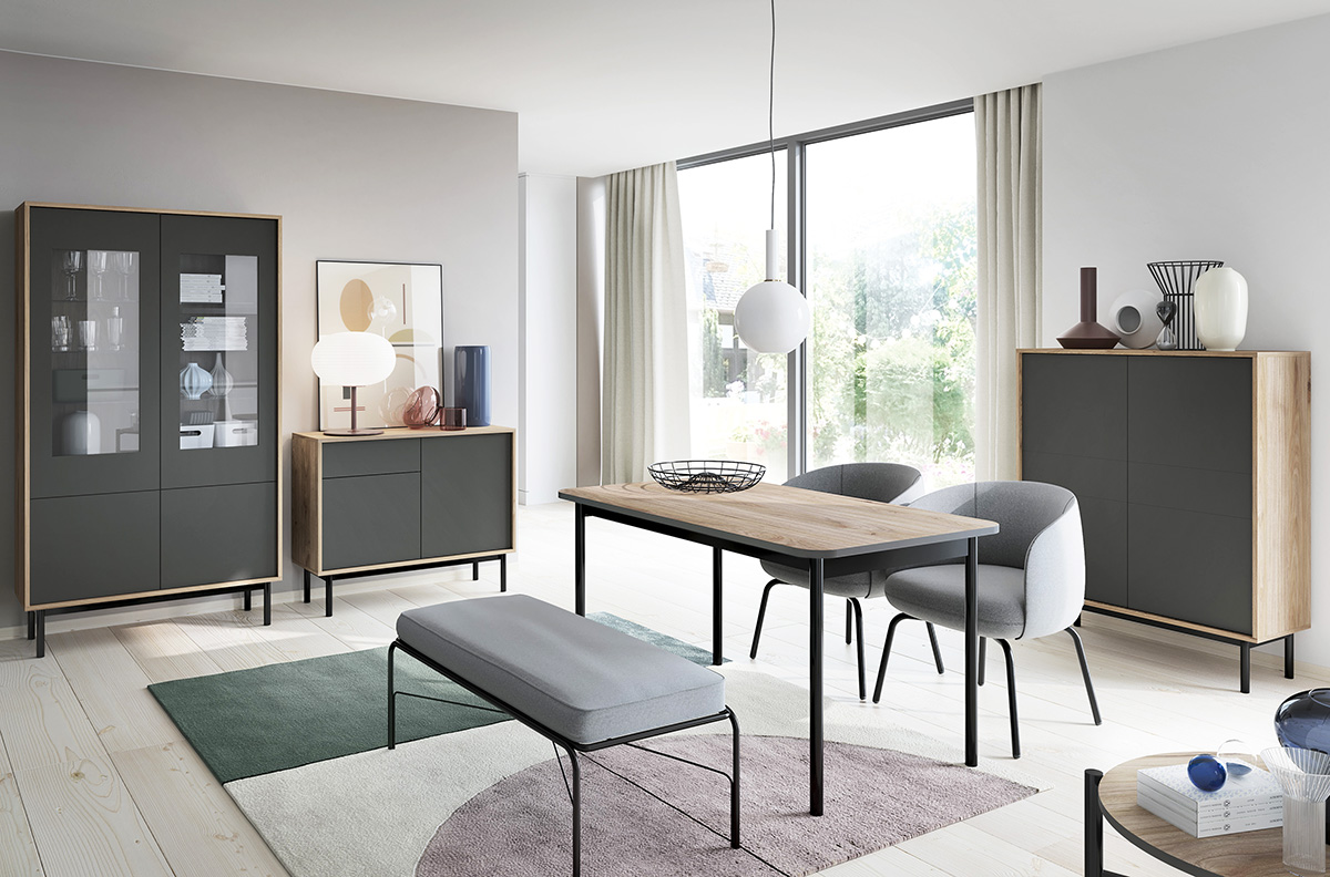Nábytkový systém Basic představuje jednoduchou architektonickou formu s nevšední barevnou kombinací grafitu s teplým dřevěným dekorem. Minimalistický styl a elegantní nohy systému Basic dodají Vašim místnostem útulnou atmosféru, která potěší i Vaše hosty. Nábytek je vyroben z kvalitní laminátové dřevotřísky o síle 16 mm s ochranou ABS hranou. Zásuvky a dvířka jsou opatřeny systémem PUSH TO OPEN, který Vám umožní pouhým stiskem jejich otevření. Zboží Vám dodáme v demontu s návodem na sestavení a kováním.