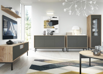 Nábytkový systém Basic představuje jednoduchou architektonickou formu s nevšední barevnou kombinací grafitu s teplým dřevěným dekorem. Minimalistický styl a elegantní nohy systému Basic dodají Vašim místnostem útulnou atmosféru, která potěší i Vaše hosty. Nábytek je vyroben z kvalitní laminátové dřevotřísky o síle 16 mm s ochranou ABS hranou. Zásuvky a dvířka jsou opatřeny systémem PUSH TO OPEN, který Vám umožní pouhým stiskem jejich otevření. Zboží Vám dodáme v demontu s návodem na sestavení a kováním.