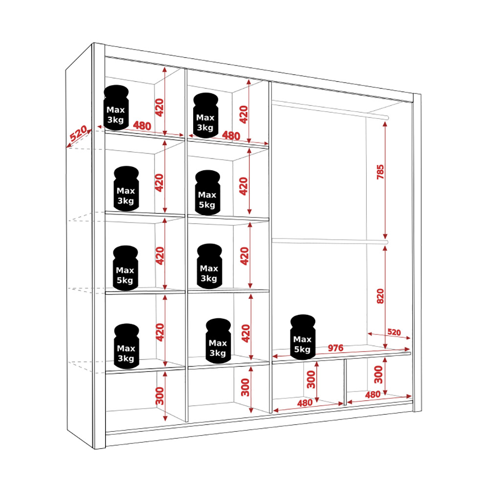 Šatní skříň Bono SZ200 disponuje 9 policemi a 2 šatními tyčemi. Ke skříni doporučujeme objednat i kontejner (skříňka se zásuvkami). Vnitřní část skříne je také v odstínu artisan.