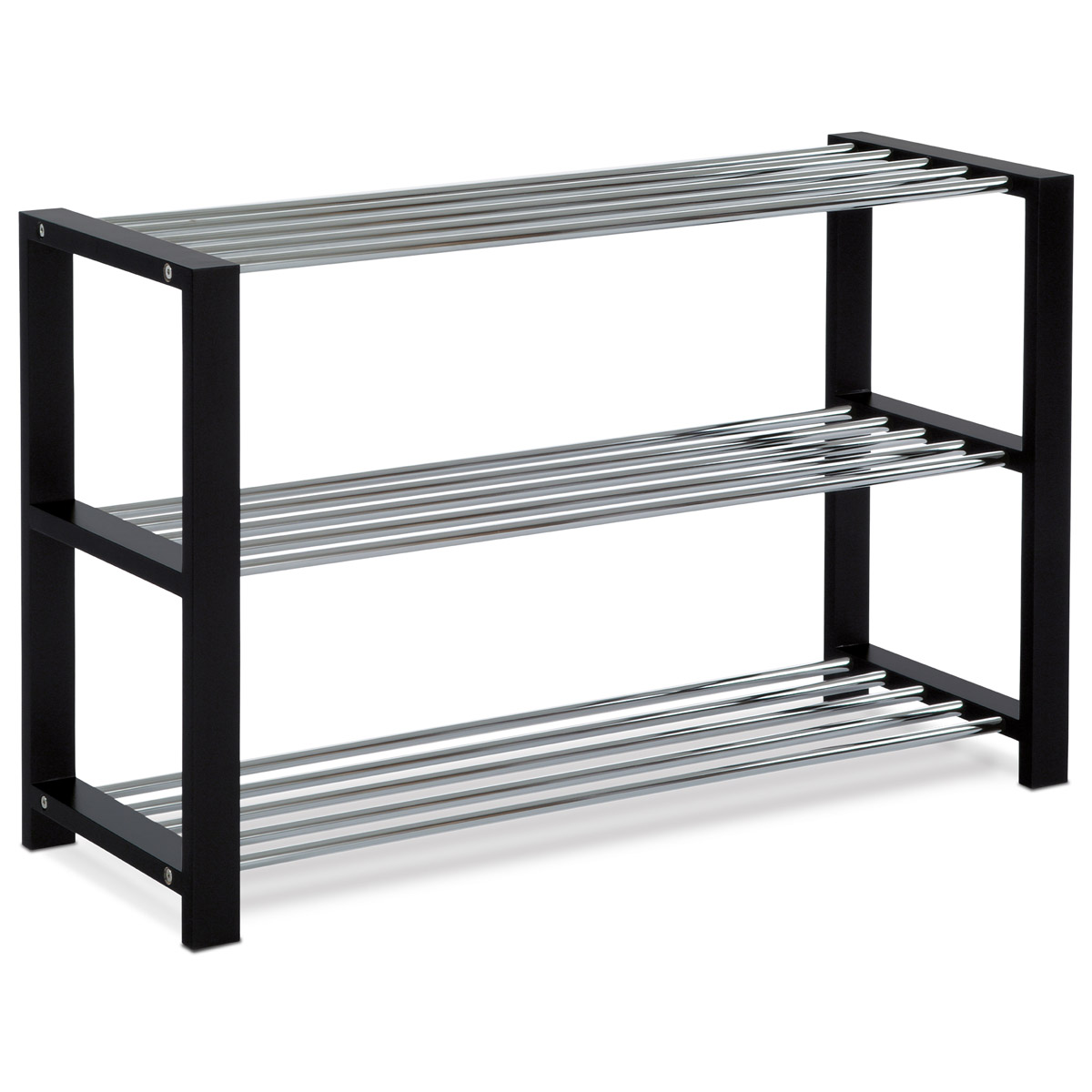 Praktický dřevěný botník s třemi kovovými rošty. Díky svým rozměrům má výbornou ložnou plochu na uložení bot, ale prostorově se vejde i do menších předsíní. Kostra botníku je z masivního kaučukovníkového dřeva v černém matném laku. Rošty jsou z kovových chromovaných trubek o průměru 12 mm. Nosnost jednotlivých polic je 4 kg. Dodáváno v demontu. S tímto botníkem budou rozházené boty po předsíni již jen minulostí.