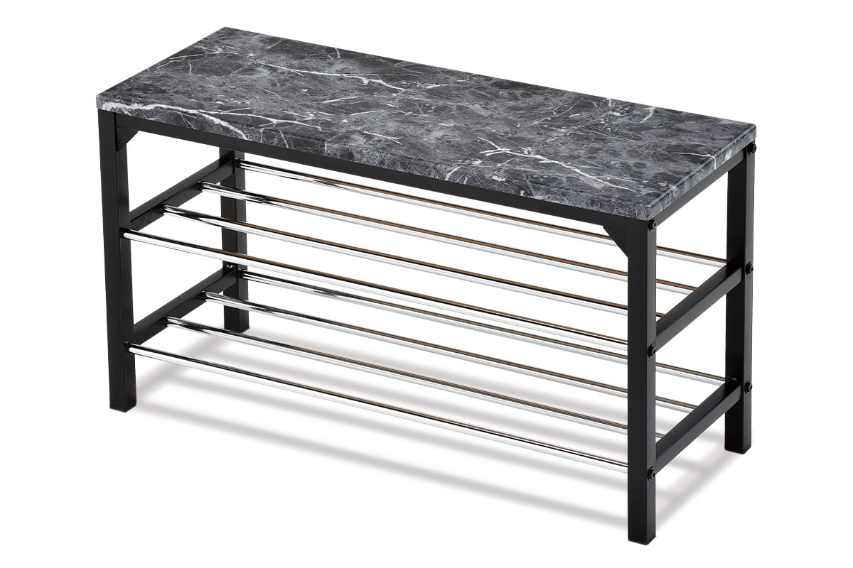 Praktický kovový botník s dvěma kovovými rošty a sedací / odkládací plochou v dekoru černý mramor.. Díky svým rozměrům má výbornou ložnou plochu na uložení bot, ale prostorově se vejde i do menších předsíní. Kovová kostra botníku je v černém matném laku, vrchní deska je z MDF. Rošty jsou z kovových chromovaných trubek o průměru. 12 mm. Nosnost jednotlivých polic je 6 kg, celková nosnost je 90 kg. Povrch vrchní desky je velmi odolný a výborně se udržuje a čistí. S tímto botníkem bude přezouvání vždy pohodlné a bezpečné a rozházené boty po předsíni budou již jen minulostí.