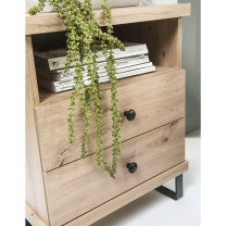 Noční stolek Cali C-17 - Nábytkový systém Cali nabízí širokou škálu jednotlivých dílů, ze kterých si snadno sestavíte obývací pokoj, ložnici, jídelnu i předsíň. Kolekce Cali přináší nejnovější styl nábytku. Kombinace dřevěného dekoru artisan s černou a lamelami vytvoří ve vašem domově moderní a neokázalé prostředí. K některým jednotlivým dílům si lze objednat kovové černé nohy, které plní nejen estetický dojem ale zároveň je oceníte i při úklidu. Stylové nohy jsou vysoké 10 cm. Nábytek Cali je vyroben z kvalitní laminátové dřevotřísky o síle 16 mm s ochrannou ABS hranou. Spodní a horní desky jsou zesílené a dodávají tak nábytku masivní vzhled. Záda zpevňují HDF desky s omyvatelnou vnitřní stranou. Ozdobné lamely jsou vyrobeny z MDF desek. Dvířka jsou opatřena panty s tichým dovíráním. Stačí dvířka trochu přivřít a ona se sama dovřou. Zásuvky disponují ložiskovými pojezdy zajišťující hladký posun. K vitrínám doporučujeme objednat i LED osvětlení, které zpříjemní tmavé večery a vytvoří příjemnou atmosféru. LED osvětlení se skládá ze zdroje světla, kabelu, vypínače a klasické zástrčky do elektrické sítě. Nábytek Vám dodáme v demontu s podrobným návodem na sestavení a kováním.