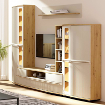 Vitríny zahrnuté v této kolekci jsou vybaveny LED osvětlením, které dodává vašemu obývacímu prostoru příjemnou atmosféru a zvýrazňuje eleganci kolekce Candy, zejména v kombinaci s harmonickou barevnou kombinací dubu artisan a odstínu kašmír.