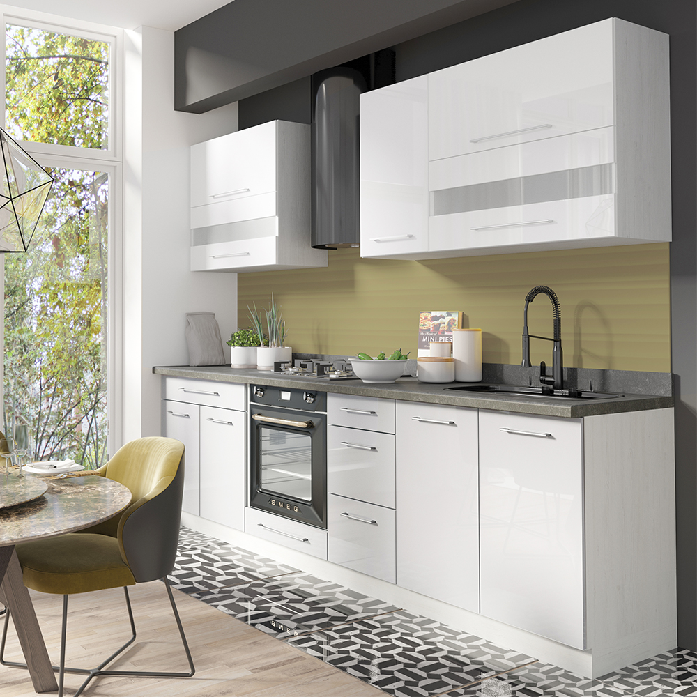 Dvířka z MDF desek (16 mm) jsou na přední straně potažena lesklou bílou fólií, která kuchyni dodá moderní, čistý vzhled.