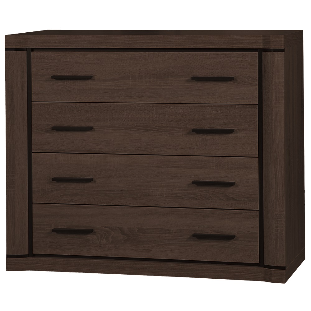 Komoda Dallas D2 - Obývací pokoj Dallas nabízí širokou škálu komod, skříňí a dalšího vybavení. Snadno si s touto kolekcí zařídíte velký i menší obývací pokoj podle vlastních představ. Zajímavost systému Dallas představují elegantní zaoblené hrany. Nábytek je vyroben z kvalitní laminátové dřevotřísky o síle 16 mm s ochrannou ABS hranou. Spodní a vrchní desky jsou zesílené na 48 mm a dodávají tak nábytku bytelný a masivní vzhled. Zboží Vám dodáme v demontu s podrobným návodem na sestavení a kováním. K vitrínám z této kolekce doporučujeme zakoupit LED osvětlení, které zpříjemní tmavé večery v obývacím pokoji. Zásuvky jsou opatřeny kolečkovými pojezdy a plastovými madly v černém odstínu.