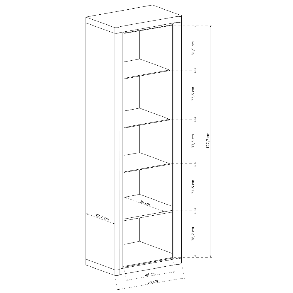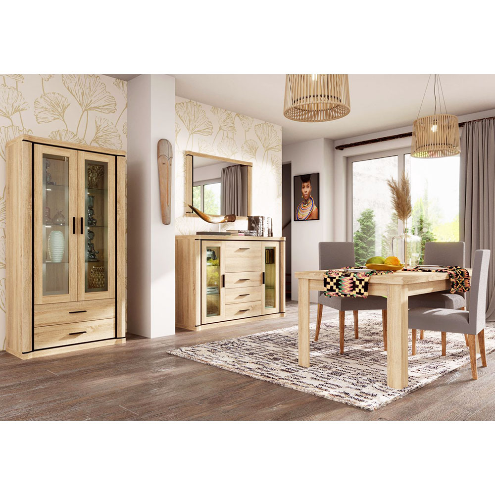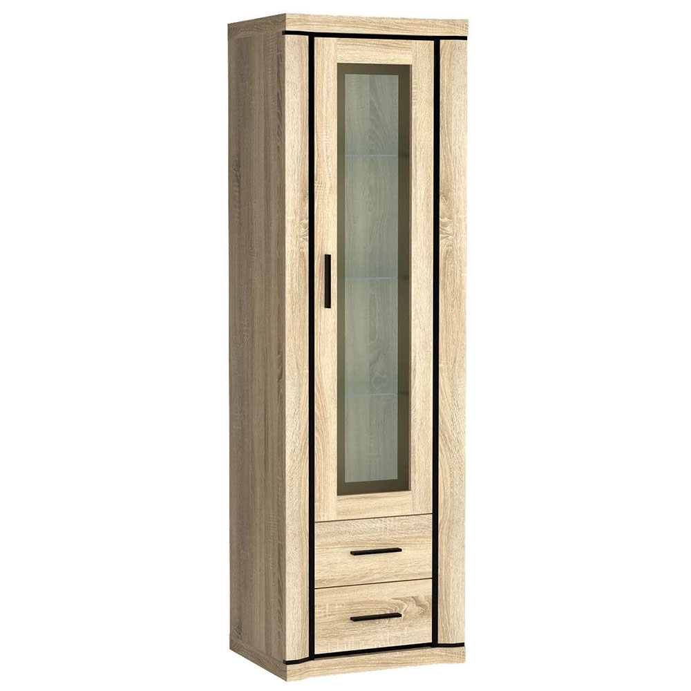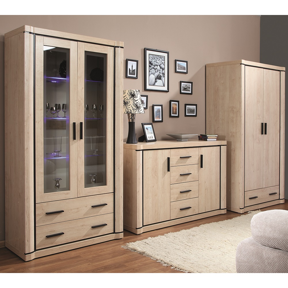 Vitrína Dallas D16 - Obývací pokoj Dallas nabízí širokou škálu komod, skříňí a dalšího vybavení. Snadno si s touto kolekcí zařídíte velký i menší obývací pokoj podle vlastních představ. Zajímavost systému Dallas představují elegantní zaoblené hrany. Nábytek je vyroben z kvalitní laminátové dřevotřísky o síle 16 mm s ochrannou ABS hranou. Spodní a vrchní desky jsou zesílené na 48 mm a dodávají tak nábytku bytelný a masivní vzhled. Zboží Vám dodáme v demontu s podrobným návodem na sestavení a kováním. K vitrínám z této kolekce doporučujeme zakoupit LED osvětlení, které zpříjemní tmavé večery v obývacím pokoji. Zásuvky jsou opatřeny kolečkovými pojezdy a plastovými madly v černém odstínu.