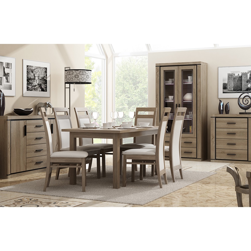Komoda Dallas D2 - Obývací pokoj Dallas nabízí širokou škálu komod, skříňí a dalšího vybavení. Snadno si s touto kolekcí zařídíte velký i menší obývací pokoj podle vlastních představ. Zajímavost systému Dallas představují elegantní zaoblené hrany. Nábytek je vyroben z kvalitní laminátové dřevotřísky o síle 16 mm s ochrannou ABS hranou. Spodní a vrchní desky jsou zesílené na 48 mm a dodávají tak nábytku bytelný a masivní vzhled. Zboží Vám dodáme v demontu s podrobným návodem na sestavení a kováním. K vitrínám z této kolekce doporučujeme zakoupit LED osvětlení, které zpříjemní tmavé večery v obývacím pokoji. Zásuvky jsou opatřeny kolečkovými pojezdy a plastovými madly v černém odstínu.