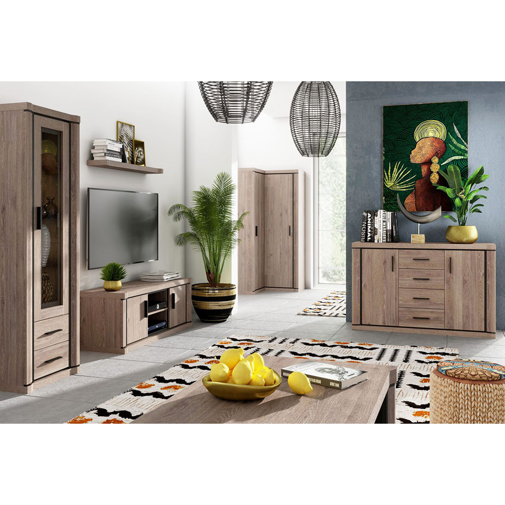 Komoda Dallas D5 - Obývací pokoj Dallas nabízí širokou škálu komod, skříňí a dalšího vybavení. Snadno si s touto kolekcí zařídíte velký i menší obývací pokoj podle vlastních představ. Zajímavost systému Dallas představují elegantní zaoblené hrany. Nábytek je vyroben z kvalitní laminátové dřevotřísky o síle 16 mm s ochrannou ABS hranou. Spodní a vrchní desky jsou zesílené na 48 mm a dodávají tak nábytku bytelný a masivní vzhled. Zboží Vám dodáme v demontu s podrobným návodem na sestavení a kováním. K vitrínám z této kolekce doporučujeme zakoupit LED osvětlení, které zpříjemní tmavé večery v obývacím pokoji. Zásuvky jsou opatřeny kolečkovými pojezdy a plastovými madly v černém odstínu.