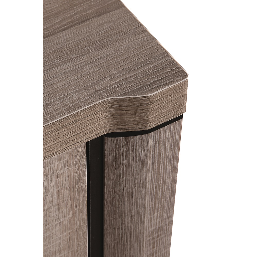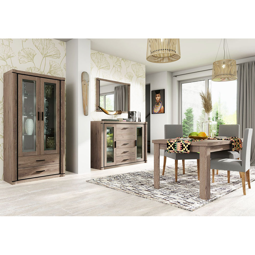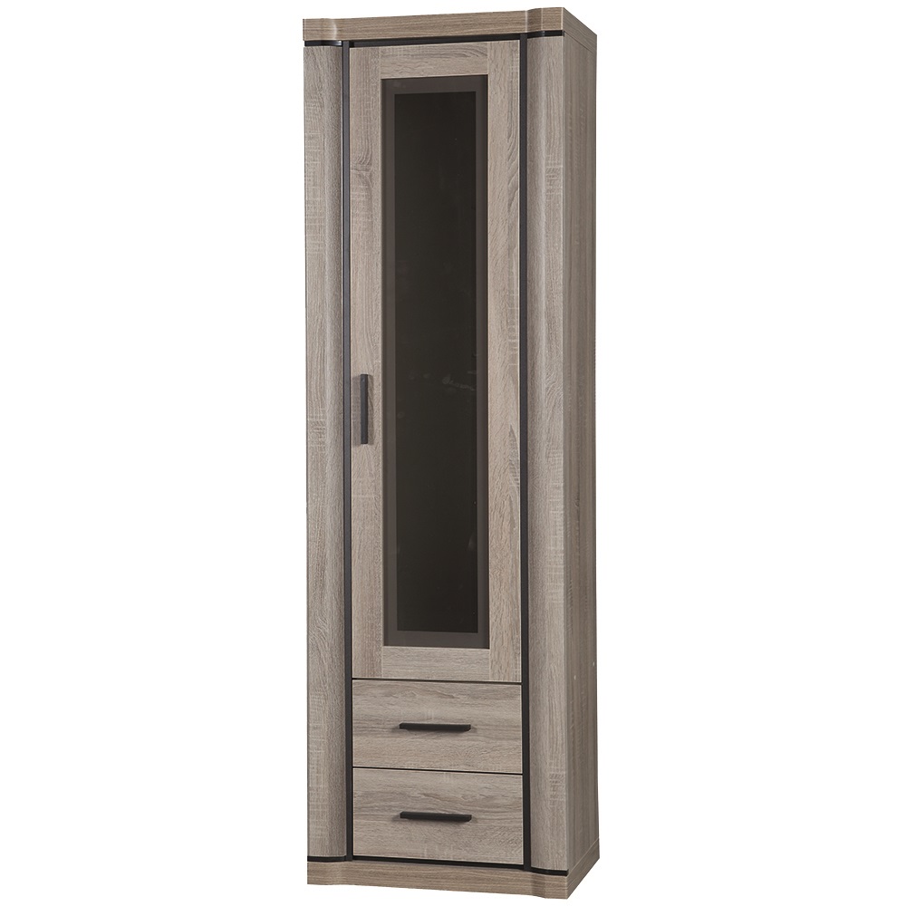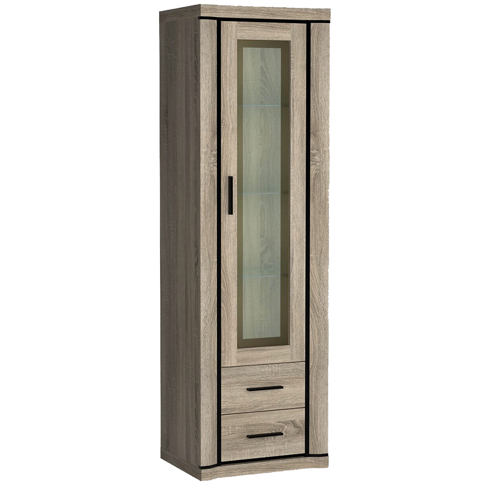 Vitrína Dallas D16 - Obývací pokoj Dallas nabízí širokou škálu komod, skříňí a dalšího vybavení. Snadno si s touto kolekcí zařídíte velký i menší obývací pokoj podle vlastních představ. Zajímavost systému Dallas představují elegantní zaoblené hrany. Nábytek je vyroben z kvalitní laminátové dřevotřísky o síle 16 mm s ochrannou ABS hranou. Spodní a vrchní desky jsou zesílené na 48 mm a dodávají tak nábytku bytelný a masivní vzhled. Zboží Vám dodáme v demontu s podrobným návodem na sestavení a kováním. K vitrínám z této kolekce doporučujeme zakoupit LED osvětlení, které zpříjemní tmavé večery v obývacím pokoji. Zásuvky jsou opatřeny kolečkovými pojezdy a plastovými madly v černém odstínu.