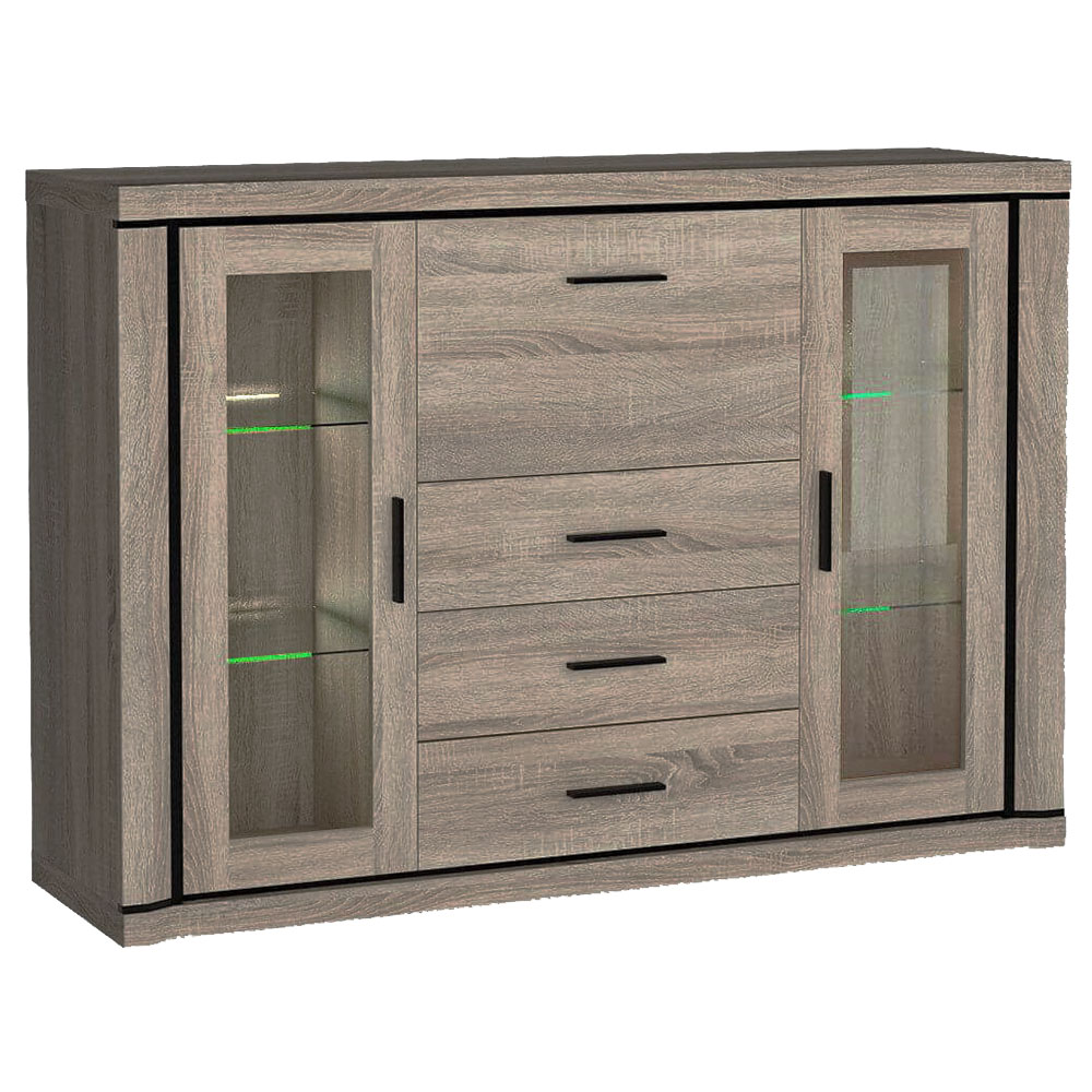 Vitrína Dallas D7 - Obývací pokoj Dallas nabízí širokou škálu komod, skříňí a dalšího vybavení. Snadno si s touto kolekcí zařídíte velký i menší obývací pokoj podle vlastních představ. Zajímavost systému Dallas představují elegantní zaoblené hrany. Nábytek je vyroben z kvalitní laminátové dřevotřísky o síle 16 mm s ochrannou ABS hranou. Spodní a vrchní desky jsou zesílené na 48 mm a dodávají tak nábytku bytelný a masivní vzhled. Zboží Vám dodáme v demontu s podrobným návodem na sestavení a kováním. K vitrínám z této kolekce doporučujeme zakoupit LED osvětlení, které zpříjemní tmavé večery v obývacím pokoji. Zásuvky jsou opatřeny kolečkovými pojezdy a plastovými madly v černém odstínu.
