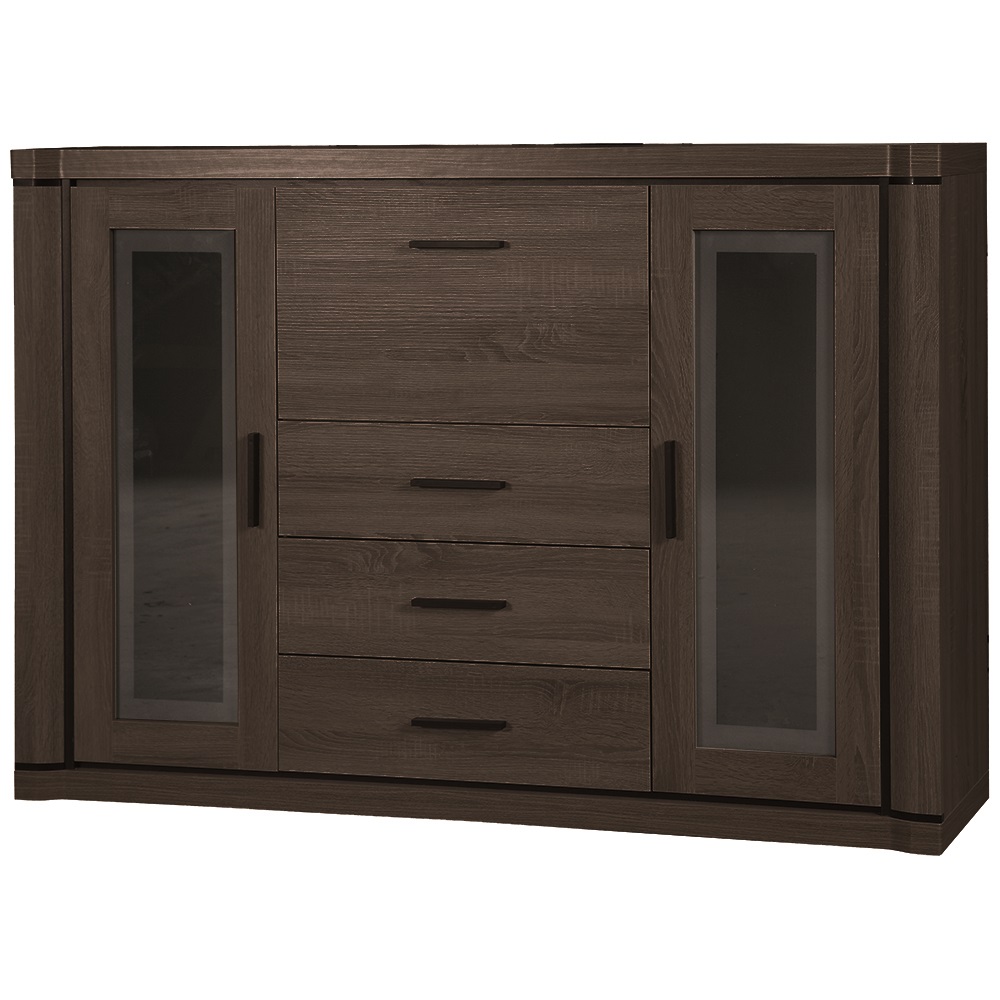 Vitrína Dallas D7 - Obývací pokoj Dallas nabízí širokou škálu komod, skříňí a dalšího vybavení. Snadno si s touto kolekcí zařídíte velký i menší obývací pokoj podle vlastních představ. Zajímavost systému Dallas představují elegantní zaoblené hrany. Nábytek je vyroben z kvalitní laminátové dřevotřísky o síle 16 mm s ochrannou ABS hranou. Spodní a vrchní desky jsou zesílené na 48 mm a dodávají tak nábytku bytelný a masivní vzhled. Zboží Vám dodáme v demontu s podrobným návodem na sestavení a kováním. K vitrínám z této kolekce doporučujeme zakoupit LED osvětlení, které zpříjemní tmavé večery v obývacím pokoji. Zásuvky jsou opatřeny kolečkovými pojezdy a plastovými madly v černém odstínu.
