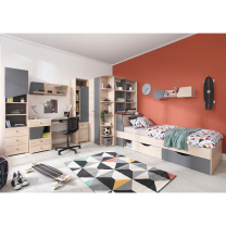 Chcete-li svým dětem vytvořit příjemné prostředí na hraní i učení, dětský pokojíček DELTA pro ně bude to pravé ořechové. Kombinace světlého dekoru dřeva dubu a šedé antracit působí neutrálně a nadčasově. Díky tomu může pokojíček sloužit malým holčičkám i kloučkům, ale i dětem studentského věku. Pokojíček vydrží dlouhá léta a jen tak se neokouká.