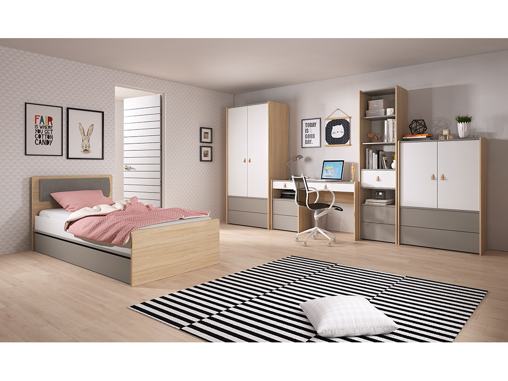 Psací stůl - Nábytkový systém Elmo je tím pravým vybavením nejen do dětských, ale i studentských pokojů. Kolekce Elmo přestavuje univerzální nábytek jak pro děvčata tak pro kluky. Elmo je designově jednoduché a nadčasové. Nábytek je vyroben z kvalitní laminátové dřevotřísky. Zboží Vám dodáme v demontu s návodem na sestavení a kováním.