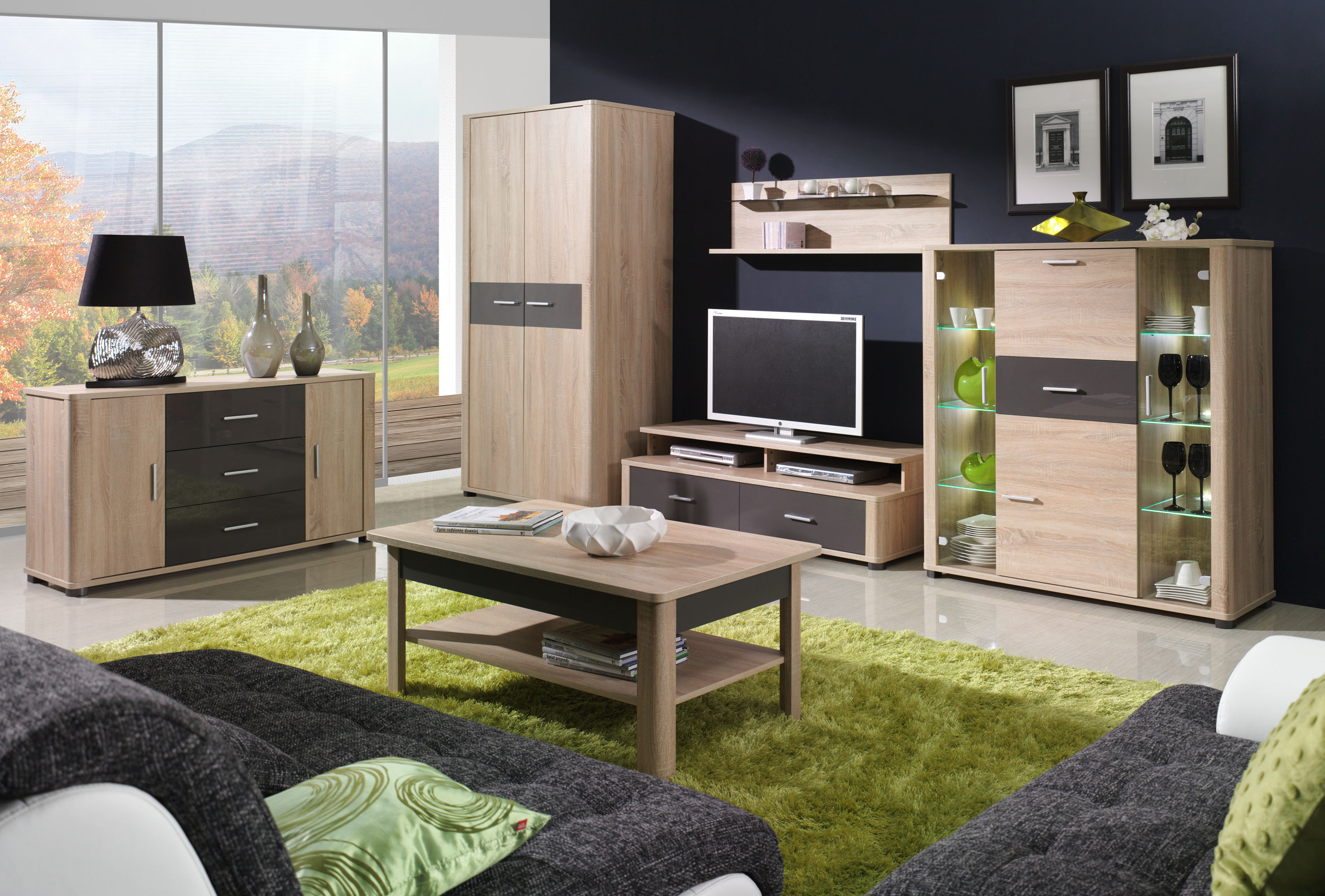 LED osvětlení - vitrína/komoda 2 - Obývací systém Fill se skládá z několika dílů, které si lze objednat v celku nebo jednotlivě. Snadno si tak sestavíte pokoj podle svých představ. Kolekci Fill nabízíme v netradiční kombinaci sonoma/grafit lesk. Nábytek je vyroben z kvalitní laminátové dřevotřísky. zboží vám dodáme v demontu s návodem na sestavení a kováním.