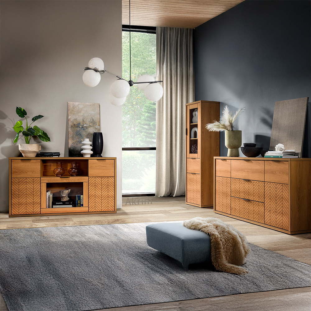 Kolekce zaujme unikátními černými lineárními detaily a matně černými úchyty, které dodávají nábytku moderní, loftový akcent. Přední plochy zdobí černý motiv rybí kosti – elegantní detail, který okamžitě upoutá pohled a podtrhuje precizní zpracování.