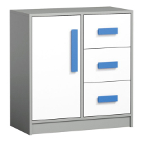 Komoda Git nízká 80 - 7 - Nábytkový systém Git vyniká především svou variabilitou a funkčností. Tento sektorový nábytek je vhodný nejen do dětských pokojíčků, ale je velice vhodný i do studentských pokojů. V nabídce tedy naleznete všechny díly nábytku, které jsou třeba pro správně vybavený pokoj. Tento sektorový nábytek byl navržen ve velmi vkusných barevných variacích. Nejen díky kombinaci kontrastních barev získá váš pokoj na dynamice, atraktivní je i hravé geometrické řešení jednotlivých funkčních částí. Základ tvoří lamino v antracytovém odstínu. Přední dvířka jsou z bílého lamina. Zajímavým prvkem u tohoto nábytku jsou masivní úchyty v 5 barvách. Hrany nábytku jsou začištěny ABS hranou. Zboží je dodáváno v demontu.