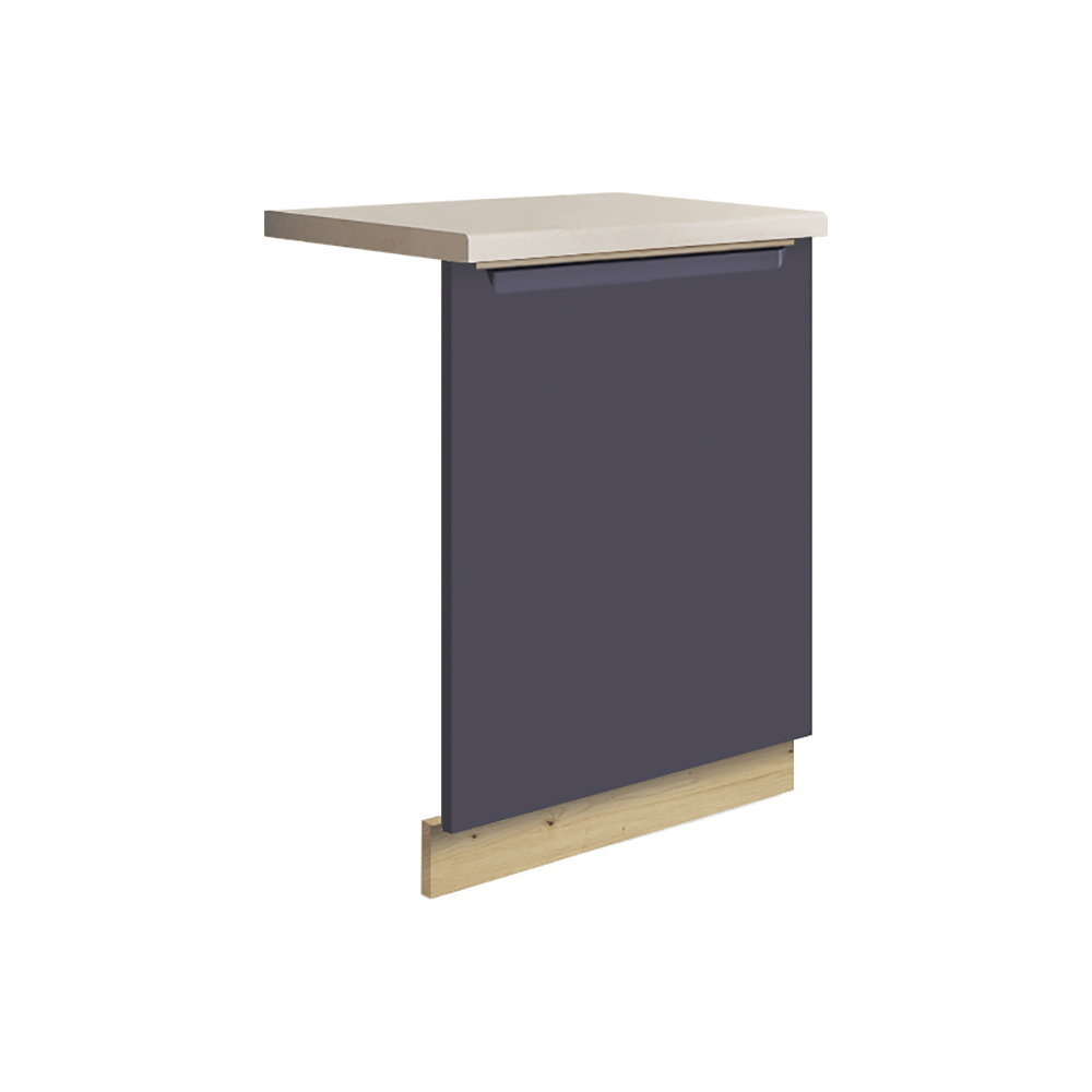 Koncové skříňky lze z boku zakončit krycími bočními deskami v odstínu korpusu, které také na stránkách nabízíme. Najdete zde tyto desky na horní, dolní i vysoké skříňky. Jejich síla je 2,5 cm. Elegantně zakončují řadu skříněk. Pracovní desky mají hloubku 60 cm a spodní skříňky 51 cm. Při instalaci pracovní desky se zpravidla nechává deska na přední straně přesahovat cca 2 cm a vzadu vznikne volný prostor mezi skříňkou a zdí 7 cm. Je to z důvodů odvětrání a instalaci vody a odpadu. Díky tomuto rozvržení Vám z boku koncové skříňky vznikne mezera 7 cm, která se právě zakrývá boční deskou.