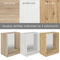 Koncové skříňky lze z boku zakončit krycími bočními deskami v odstínu korpusu, které také na stránkách nabízíme. Najdete zde tyto desky na horní, dolní i vysoké skříňky. Jejich síla je 2,5 cm. Elegantně zakončují řadu skříněk. Pracovní desky mají hloubku 60 cm a spodní skříňky 51 cm. Při instalaci pracovní desky se zpravidla nechává deska na přední straně přesahovat cca 2 cm a vzadu vznikne volný prostor mezi skříňkou a zdí 7 cm. Je to z důvodů odvětrání a instalaci vody a odpadu. Díky tomuto rozvržení Vám z boku koncové skříňky vznikne mezera 7 cm, která se právě zakrývá boční deskou.