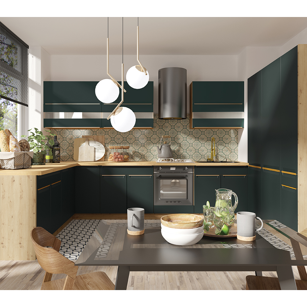 Kolekce moderní kuchyňské linky Glamour v tmavě zeleném matu přináší exkluzivní a nejmodernější skříňky do kuchyně. Atraktivní kombinace dřevěného dekoru, zelených dvířek a zlatých úchytů vytvoří příjemné a elegantní prostředí, ve kterém budete s radostí vařit. Modulová kuchyňská linka Glamour nabízí různé horní skříňky, spodní skříňky, vysoké skříňky a další doplňkový sortiment. Korpus skříněk si můžete vybrat z několika dřevěných dekorů.