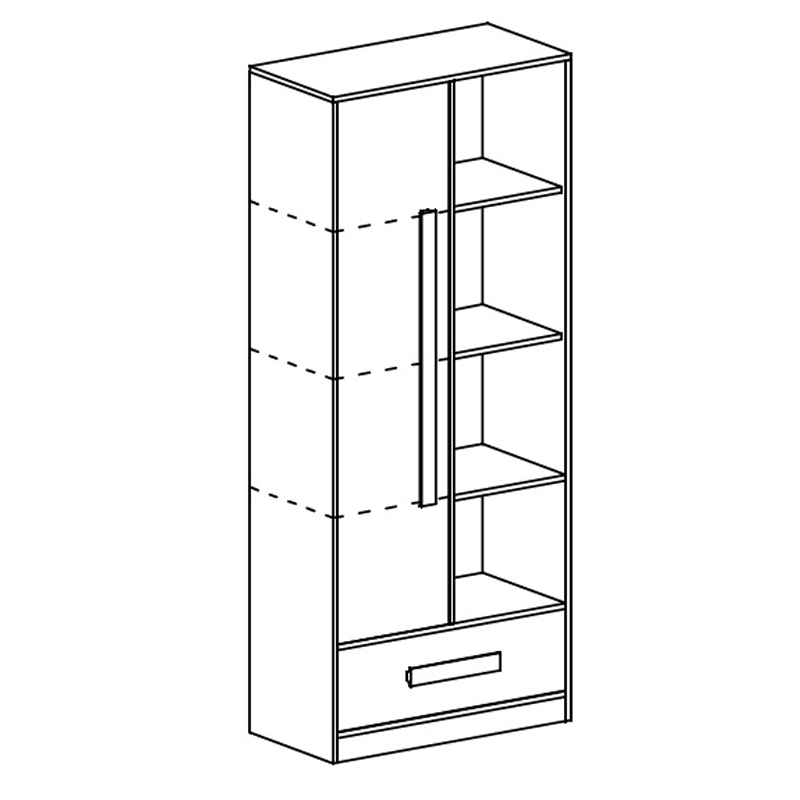 Regál Guliver 80 - 3 - Nábytkový systém Guliver vyniká především svou variabilitou a funkčností. Tento sektorový nábytek je vhodný nejen do dětských pokojíčků, ale je velice vhodný i do studentských pokojů. V nabídce tedy naleznete všechny díly nábytku, které jsou třeba pro správně vybavený pokoj. Tento sektorový nábytek byl navržen ve velmi vkusných barevných variacích. Nejen díky kombinaci kontrastních barev získá váš pokoj na dynamice, atraktivní je i hravé geometrické řešení jednotlivých funkčních částí. Základ tvoří lamino v bílém odstínu. Přední dvířka jsou popelavá v lesku. Zajímavým prvkem u tohoto nábytku jsou masivní úchyty. Hrany nábytku jsou začištěny ABS hranou. Zboží je dodáváno v demontu.