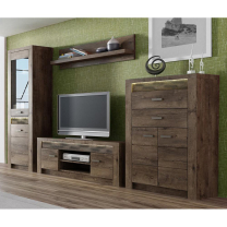 TV stolek Indianapolis I10 - Nábytkový systém Indianapolis vnese do Vašeho domova rustikální nádech. Indianapolis nabízí širokou škálu komod, skříní a dalšího nábytku, se kterým si podle svých představ vybavíte ložnici, obývací pokoj i jídelnu. Nábytek je vyroben z kvalitní laminátové dřevotřísky o síle 16 mm s ochranou ABS hranou. Záda zpevňují HDF desky s omyvatelnou vnitřní stranou. Dvířka a zásuvky disponují kovovými úchyty. Hladký posun zásuvek zajišťují ložiskové pojezdy. Některé díly z kolekce Indianapolis zdobí desky z masivu s designovým 3D reliéfem. K těmto deskám doporučujeme objednat LED lišty, které je nasvítí a dodají nábytku dynamický vzhled. Osvětlení si lze objednat i do skleněných poliček. LED osvětlení se skládá ze zdroje světla, kabelu, trafa na vypínání a zástrčky do el. sítě. Zboží Vám dodáme v demontu s podrobným návodem na sestavení a kováním.