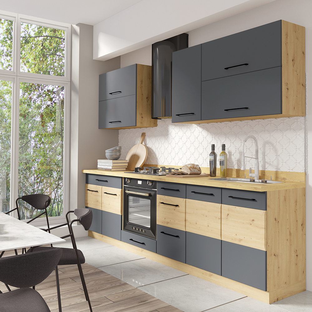 Kolekce moderní kuchyňské linky Infinity v atraktivní kombinaci dřevěného dekoru artisan a šedé mat přináší exkluzivní a nejmodernější skříňky do kuchyně. Kuchyňský nábytek Infinity vytvoří příjemné a elegantní prostředí, ve kterém budete s radostí vařit. Modulová kuchyňská linka Infinity nabízí různé horní skříňky, spodní skříňky, vysoké skříňky a další doplňkový sortiment.