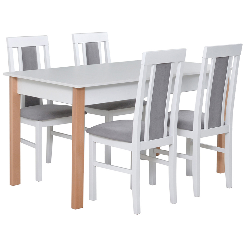 Tato jídelní sestava představuje moderní styl nábytku. Konstrukce židle tvoří masivní bukové dřevo. Odstín nohou i potahovou tkaninu si lze zvolit libovolně ze vzorníku. Deska stolu je vyrobena z laminátové desky. Nohy stolu tvoří bukové dřevo. Stůl lze snadno rozkládá. Židle Vám dodáme již smontované. Stůl Vám dodáme v demontu. Nohy stolu a deska budou zvlášť, avšak montáž je snadná.