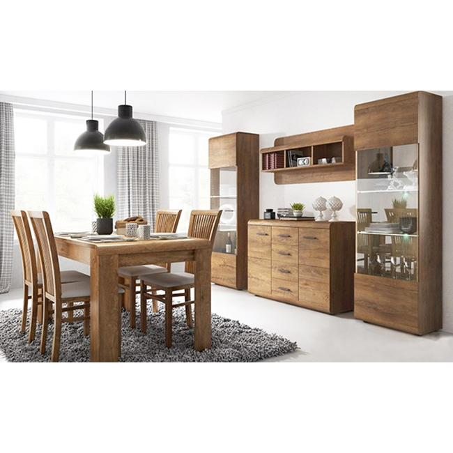 Jídelní sestava Lena potěší milovníky přírodních tónů. Tuto kolekci nabízíme ve vkusném odstínu dub lefkas. Lenu si lze objednat v již předdefinovaných sestavách nebo i po jednotlivých dílech. Nábytek je vyroben z kvalitní laminátové dřevotřísky o síle 16 mm s ochranou ABS hranou. Zboží Vám dodáme v demontu s návodem na sestavení a kováním.