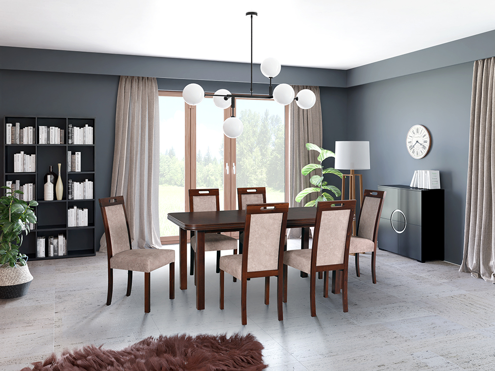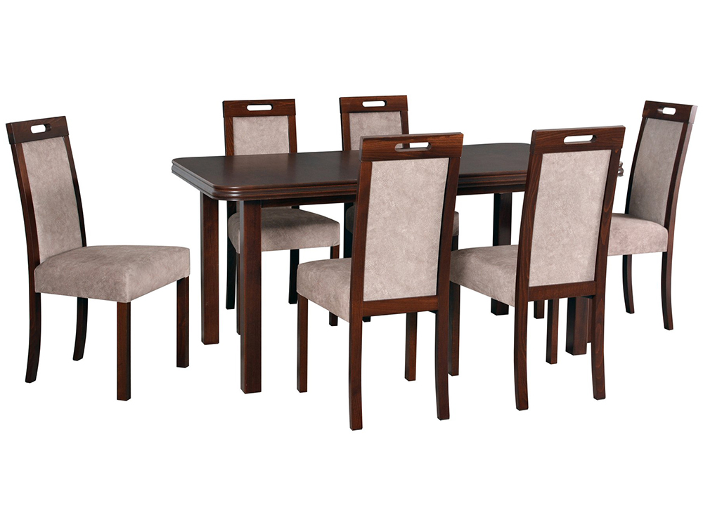 Tato jídelní sestava představuje moderní styl nábytku. Konstrukce židle tvoří masivní bukové dřevo. Odstín nohou i potahovou tkaninu si lze zvolit libovolně ze vzorníku. Deska stolu je vyrobena z dýhy. Nohy a rám stolu tvoří bukové dřevo. Stůl lze snadno rozkládá. Židle Vám dodáme již smontované. Stůl Vám dodáme v demontu. Nohy stolu a deska budou zvlášť, avšak montáž je snadná.