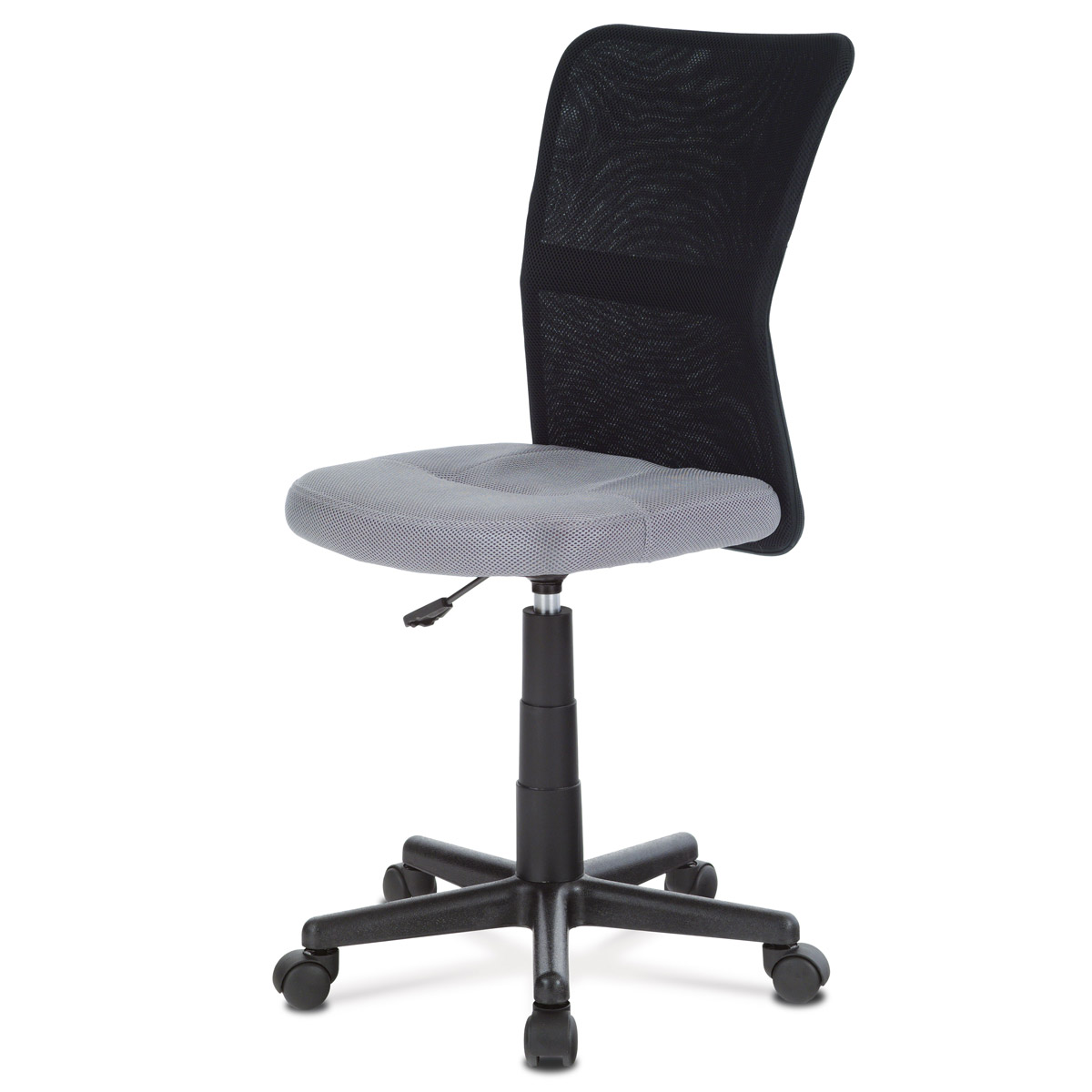 Kancelářská židle KA-2325 GREY je navržena především pro dětské uživatele, kteří ocení jednoduchý a praktický design. Opěrák je vyroben z černé prodyšné síťoviny, která zajišťuje dostatečnou ventilaci během sezení, zatímco sedák je potažen šedou mesh látkou pro příjemný komfort. Výškově nastavitelný mechanismus umožňuje snadné přizpůsobení výšky sedáku podle potřeby uživatele. Plastový kříž s pěti rameny zajišťuje stabilitu a lehkost celé židle, která je vybavena kolečky pro snadnou mobilitu. Absence područek a dalších doplňků podtrhuje minimalistický charakter tohoto modelu, vhodného do dětských pokojů nebo pracovních koutů.