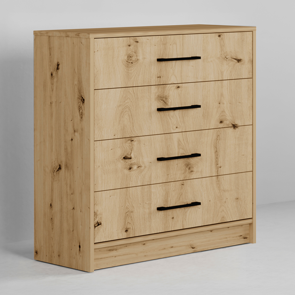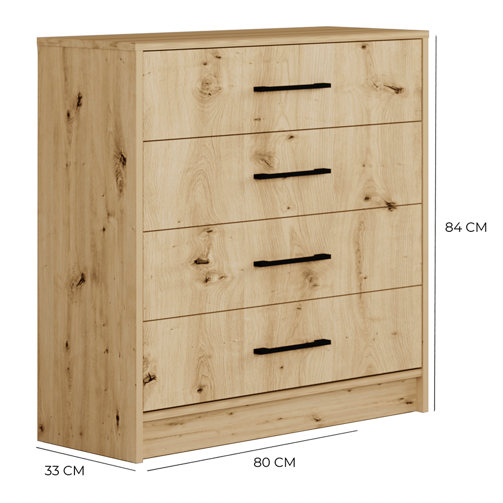 Komoda je vybavena čtyřmi praktickými zásuvkami, které poskytují dostatek místa pro oblečení, dokumenty nebo drobné předměty. Zásuvky se vysouvají snadno a plynule, takže každodenní používání je pohodlné a praktické.