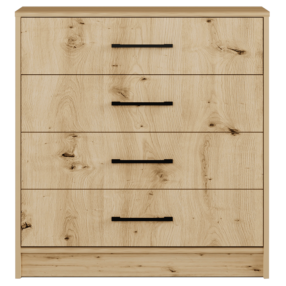 Povrch v dekoru dub artisan je doplněn o černé kovové úchyty, které vytvářejí moderní kontrast a podtrhují elegantní vzhled nábytku. Komoda je vyrobena z laminované dřevotřísky (LTD) – odolného materiálu s jednoduchou údržbou.