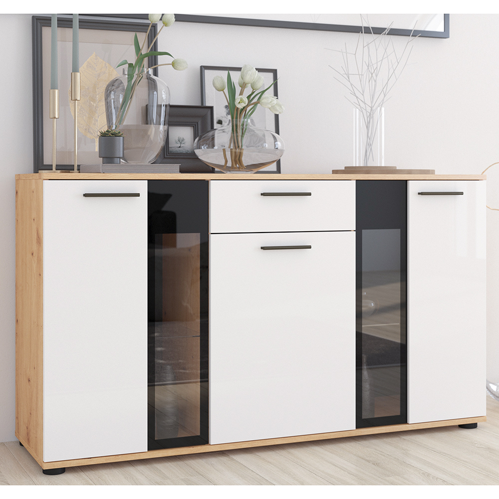 Komoda SALSA disponuje 1 zásuvkou s ložiskovými pojezdy. Za trojicí dvířek najdete praktické police - dvě skleněné a jednu z lamina, které poskytují dostatek prostoru pro Vaše předměty. Komoda je vyrobena z kvalitní laminátové dřevotřísky o síle 15 mm, zatímco záda jsou zpevněna HDF deskami s omyvatelnou vnitřní stranou, což zajišťuje stabilitu a snadnou údržbu.
