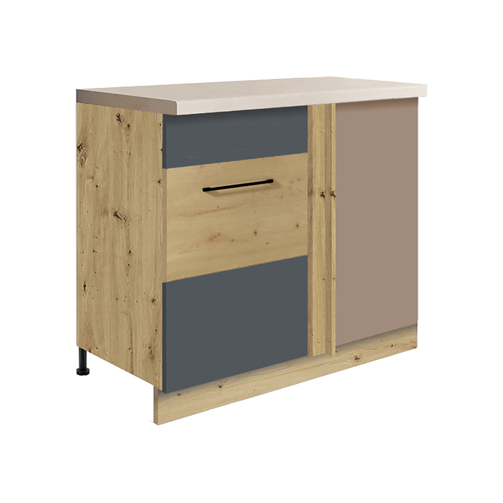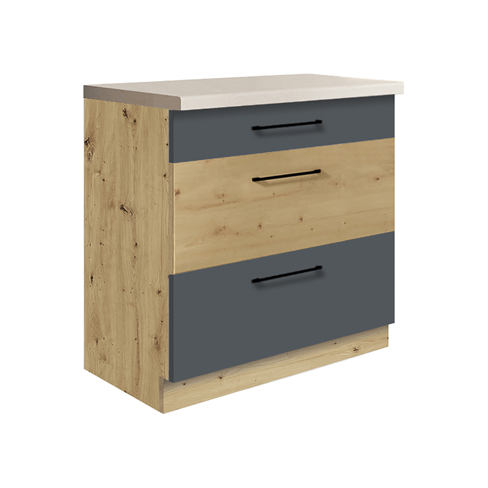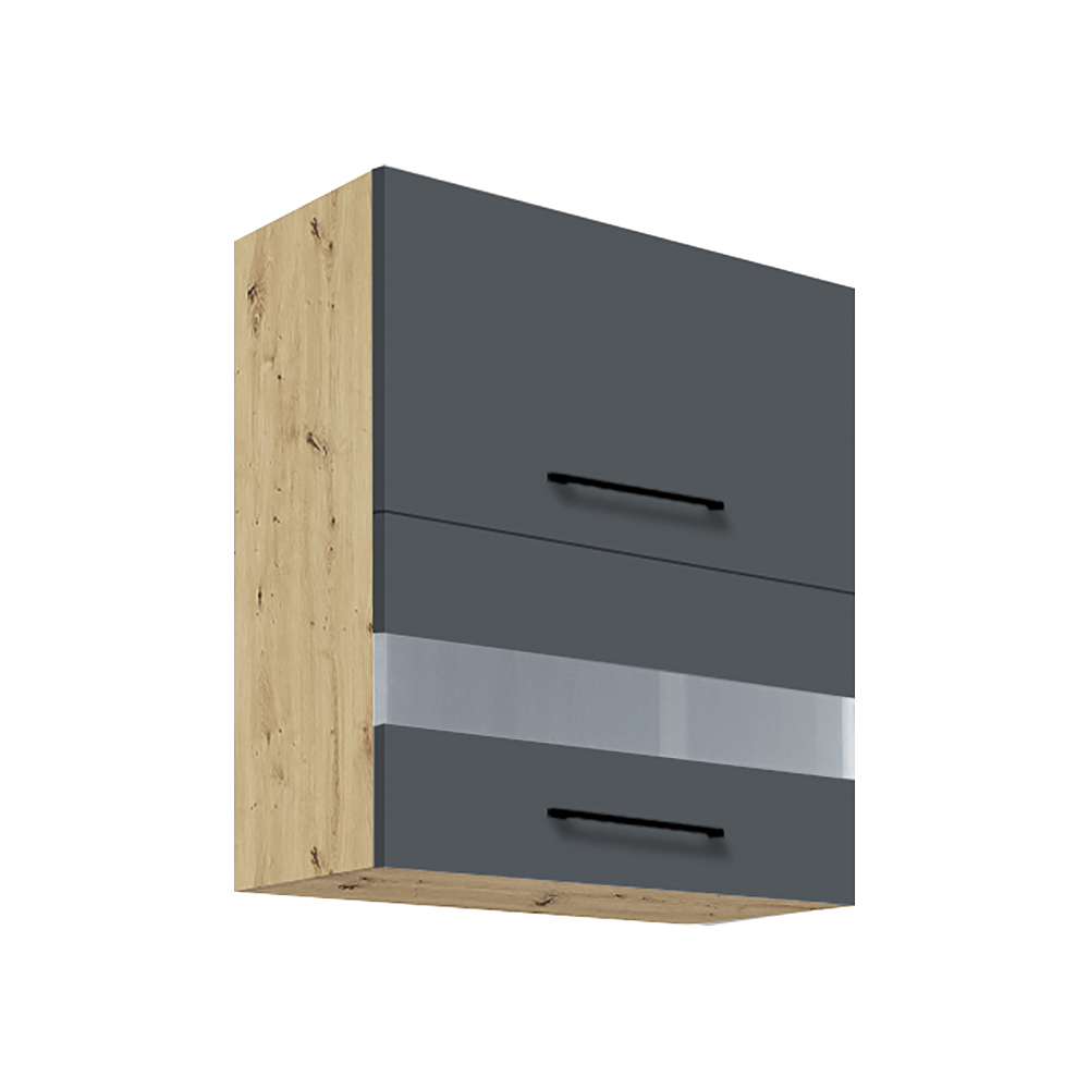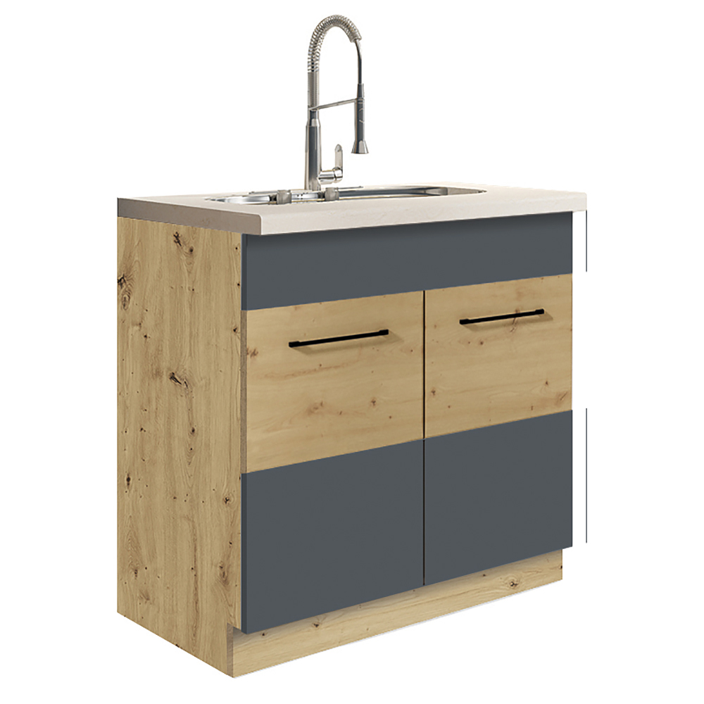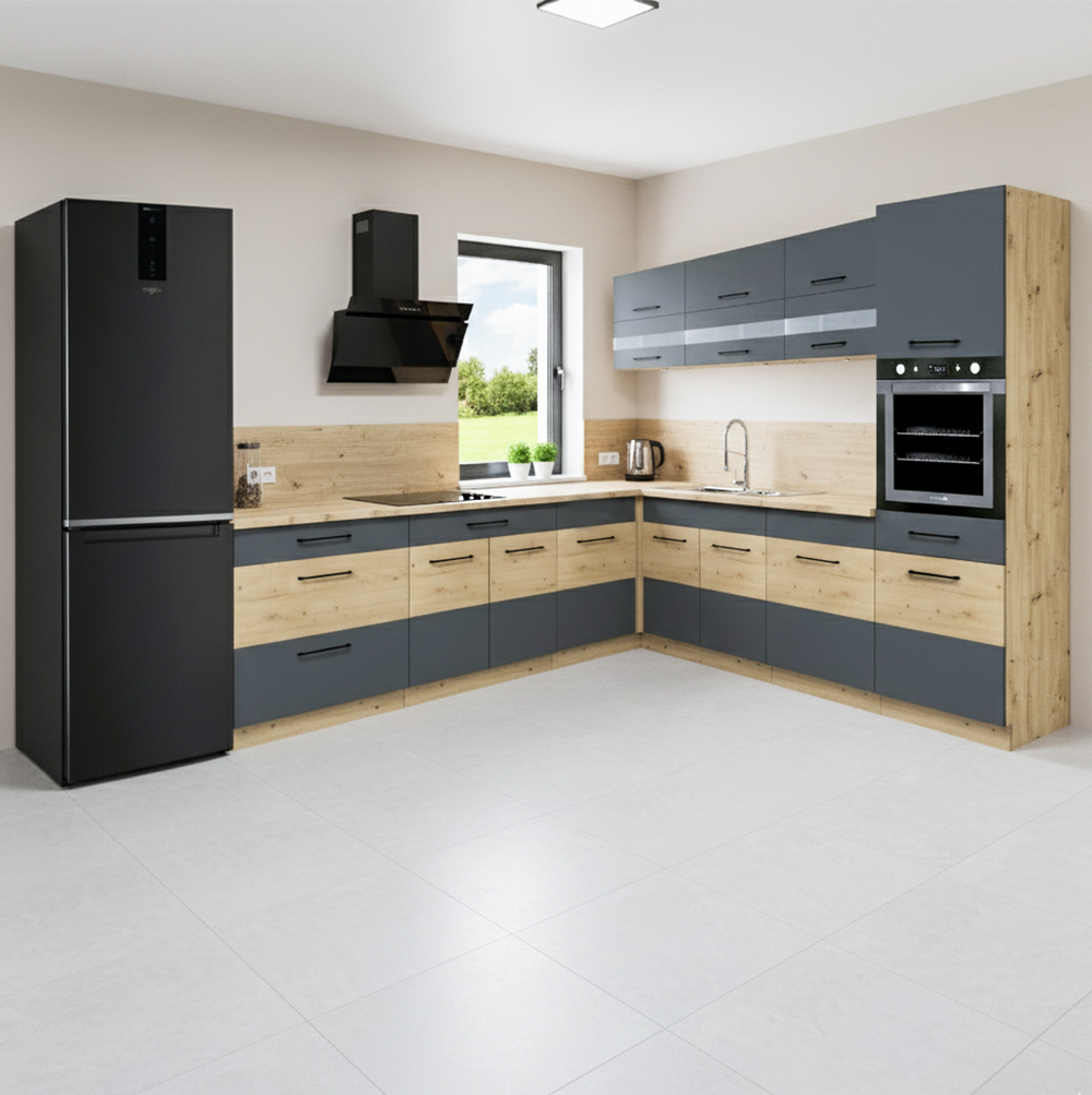 Dřevěný dekor artisan, sofistikovaná šedá dvířka a černé úchyty vytváří nadčasovou kombinaci, která promění vaši kuchyň v prostor s osobitým stylem.