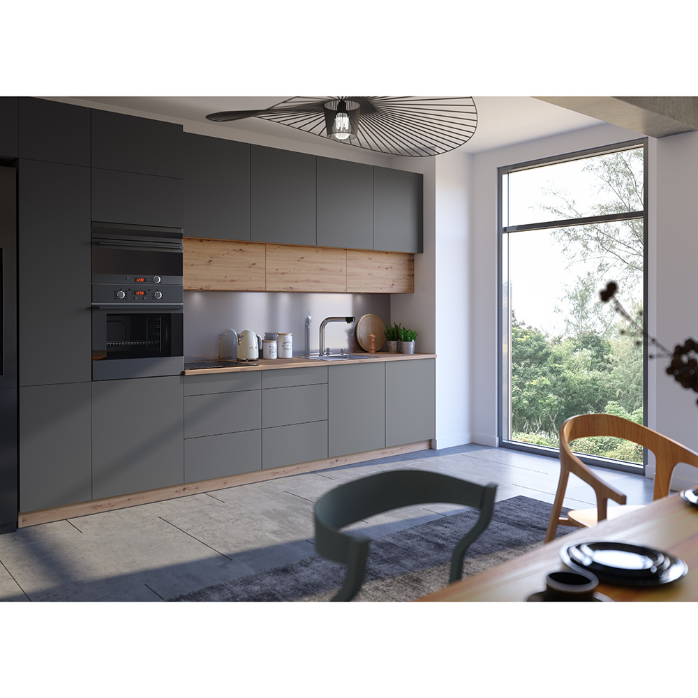 - Kombinace dřevodekoru dub artisan a sofistikované šedé v matném provedení dodá kuchyni nadčasový šmrnc a příjemné teplo domova.
