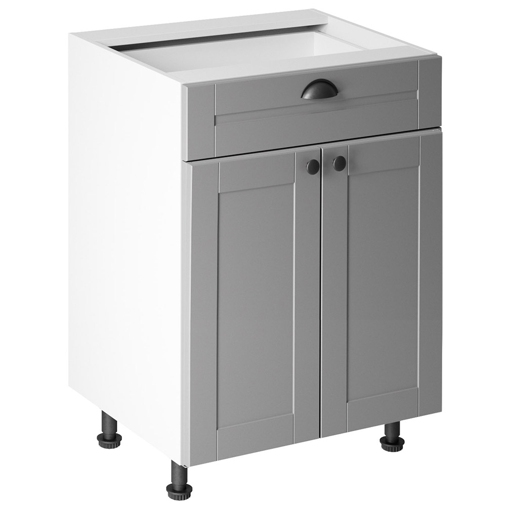 Dolní skříňka Linea D60S1 - Modulová kuchyňská linka Linea potěší každého milovníka netradičního stylu anglického venkova. Lineu nabízíme v atraktivní šedé matné barvě v kombinaci s bílými korpusy. V této kuchyňské kolekci si můžete vybrat předdefinované sestavy, či jednotlivé díly, ze kterých si sestavíte linku na míru a podle svých představ. Zásuvky a dvířka doplňují decentní, černá, kovová madla. Zásuvky jsou opatřeny ložiskovými pojezdy s funkcí tichého dojezdu zajišťující hladkou manipulaci. Korpus nábytku Linea tvoří kvalitní laminátová dřevotříska o síle 16 mm s ochrannou ABS hranou. Dvířka jsou vyrobena z MDF desek. Na záda se používají desky HDF v bílém omyvatelném odstínu (z vnitřní strany skříněk). Součástí spodních skříněk jsou krycí sokly s úchyty. Výšku spodních skříněk si můžete upravovat pomocí štelovacích nožiček. Zboží Vám dodáme v demontu s podrobným návodem na sestavení a kováním. Montáž je snadná. Ke kuchyňské lince Linea nabízíme také pracovní desky ve vícero dekorech.