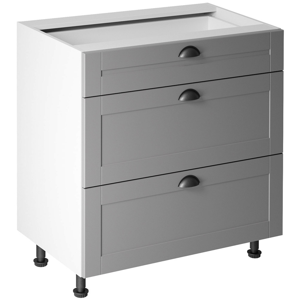 Dolní skříňka Linea D80S3 - Modulová kuchyňská linka Linea potěší každého milovníka netradičního stylu anglického venkova. Lineu nabízíme v atraktivní šedé matné barvě v kombinaci s bílými korpusy. V této kuchyňské kolekci si můžete vybrat předdefinované sestavy, či jednotlivé díly, ze kterých si sestavíte linku na míru a podle svých představ. Zásuvky a dvířka doplňují decentní, černá, kovová madla. Zásuvky jsou opatřeny ložiskovými pojezdy s funkcí tichého dojezdu zajišťující hladkou manipulaci. Korpus nábytku Linea tvoří kvalitní laminátová dřevotříska o síle 16 mm s ochrannou ABS hranou. Dvířka jsou vyrobena z MDF desek. Na záda se používají desky HDF v bílém omyvatelném odstínu (z vnitřní strany skříněk). Součástí spodních skříněk jsou krycí sokly s úchyty. Výšku spodních skříněk si můžete upravovat pomocí štelovacích nožiček. Zboží Vám dodáme v demontu s podrobným návodem na sestavení a kováním. Montáž je snadná. Ke kuchyňské lince Linea nabízíme také pracovní desky ve vícero dekorech.