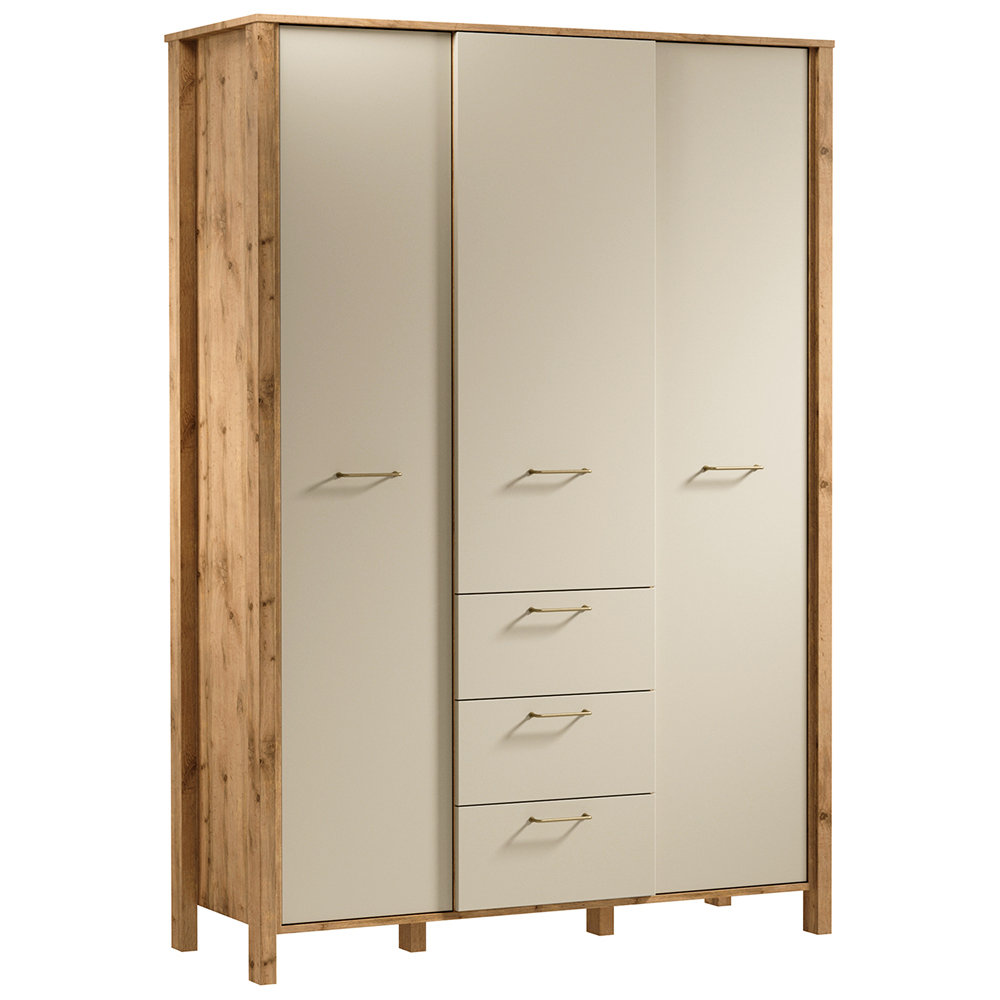 Charakteristickým prvkem kolekce jsou kovové úchytky v matně zlaté barvě, které dodávají nábytku nádech elegance. Jejich ergonomický tvar zajišťuje pohodlné otevírání a současně podtrhuje moderní vzhled nábytku. Zlaté detaily vytvářejí jemný kontrast k přírodnímu dřevěnému dekoru a přidávají celkové estetice kolekce na jedinečnosti.