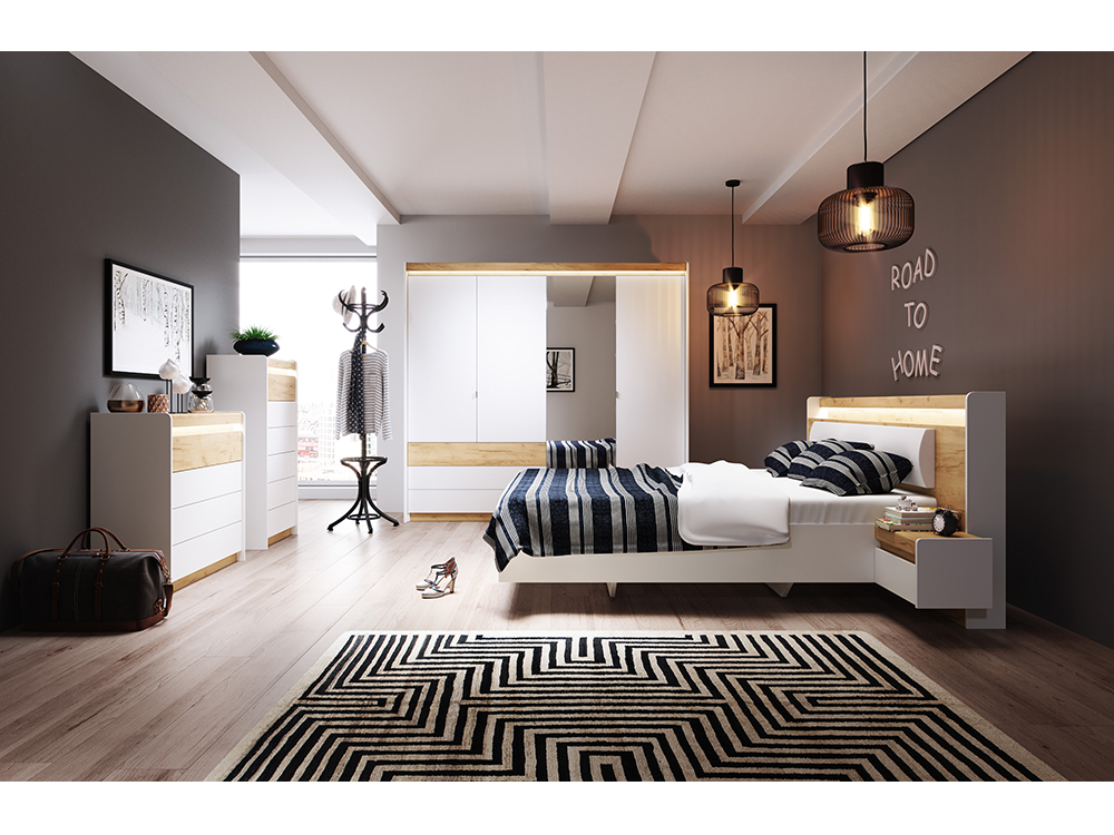 Ložnice Lava A - Nábytkový systém Lava – je kombinací příjemných barev, které jsou zvýrazněné zaoblenými hranami a zajímavě integrovaným LED osvětlením. Nábytek je vyroben z kvalitní laminátové dřevotřísky s ochranou ABS hranou. Zboží Vám dodáme v demontu s návodem na sestavení a kováním.