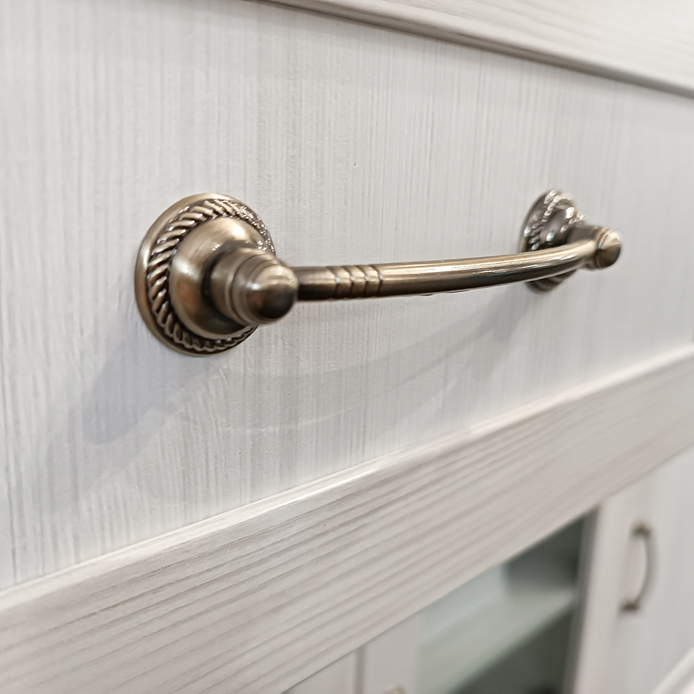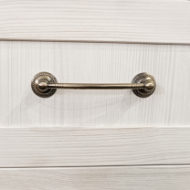 - Stylové detaily: kovové úchytky s patinou krásně ladí s čely.