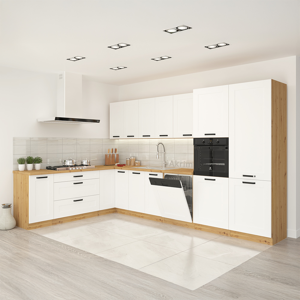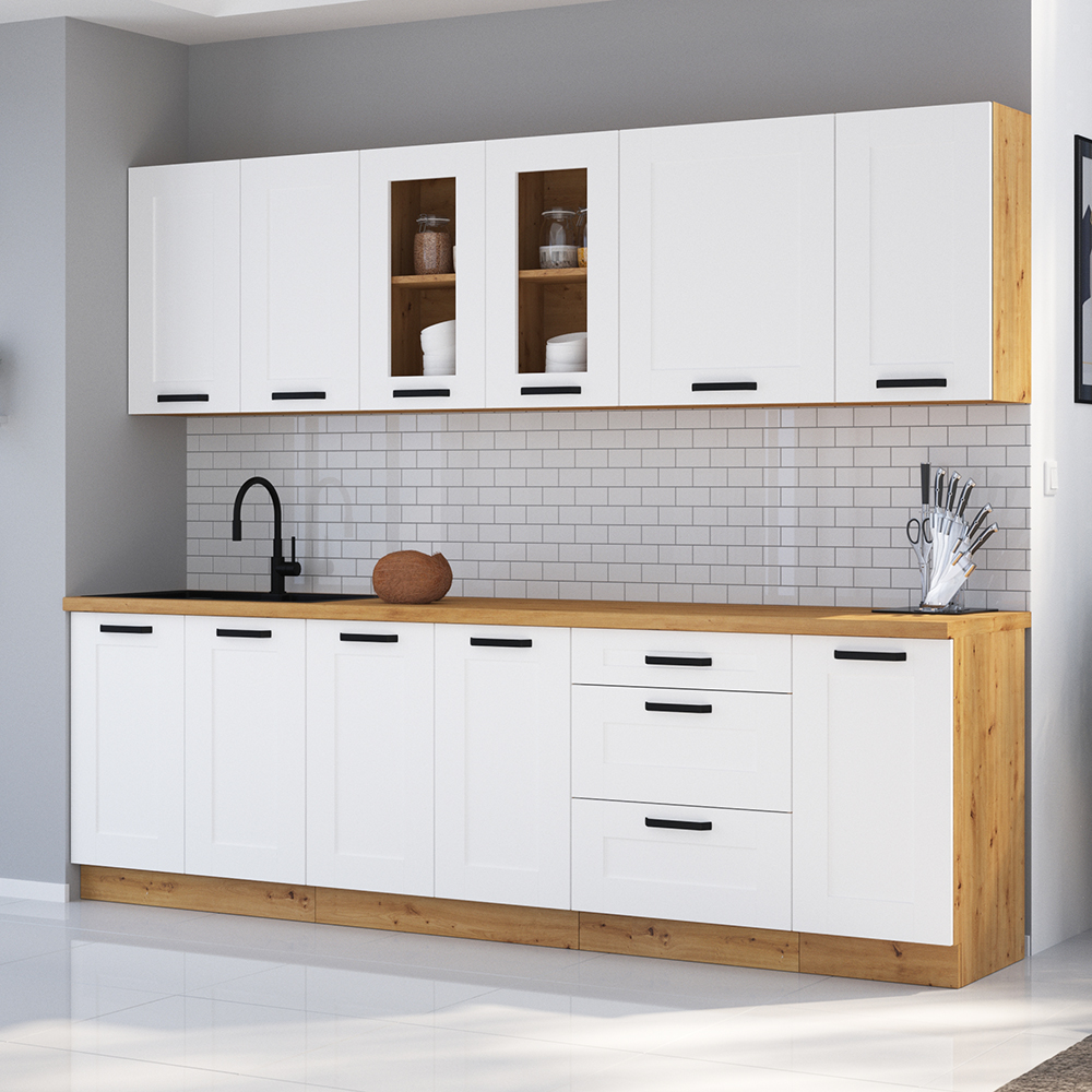 Každý prvek kuchyňské linky LUNA byl navržen s ohledem na estetiku a funkčnost. Dvířka s decentním 3D povrchem v bílém odstínu a černé kovové úchytky přidávají celé sestavě nádech elegance. Korpus z kvalitní laminátové dřevotřísky v dekoru dub artisan a dvířka z MDF desek o síle 19 mm zajišťují odolnost a dlouhou životnost. Navíc panty s tichým dovíráním přispívají k poklidné a harmonické atmosféře Vaší kuchyně.