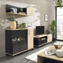 Nábytkový systém Madison dodá Vašemu interiéru moderní vzhled. Tento nábytek nabízíme v atraktivní barevné kombinaci černá + dub. Kolekci Madison lze zakoupit po jednotlivých dílech nebo v předdefinovaných sestavách. Nábytek je vyroben z kvalitní laminátové dřevotřísky o síle 16 mm s ochranou ABS hranou. Úchyty a nohy jsou kovové. Zboží Vám dodáme v demontu s návodem na sestavení a kováním.
