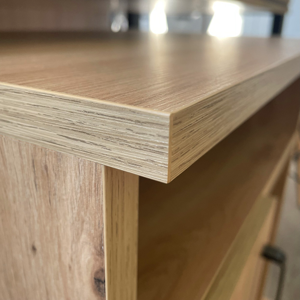 Korpus je vyroben z kvalitní laminátové dřevotřísky o síle 18 mm s ochrannou PCV hranou. Dvířka a zásuvky jsou vyrobené z desek o síle 16 mm a disponují černými kovovými úchyty. Dvířka se snadno dovírají díky systému tichého dovírání. Záda zpevňují HDF desky s omyvatelnu vnitřní stranou v dekoru artisan. Zásuvky jsou opatřeny ložiskovými pojezdy pro hladký posun. Dvířka i zásuvky snadno zavřete díky tichému dovírání.