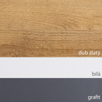 Jako barevnou kombinaci volil výrobce nadčasové odstíny příjemného hřejivého zlatého dubu a jako kontrast prvky bílé a grafitové. Úchytky jsou kovové.