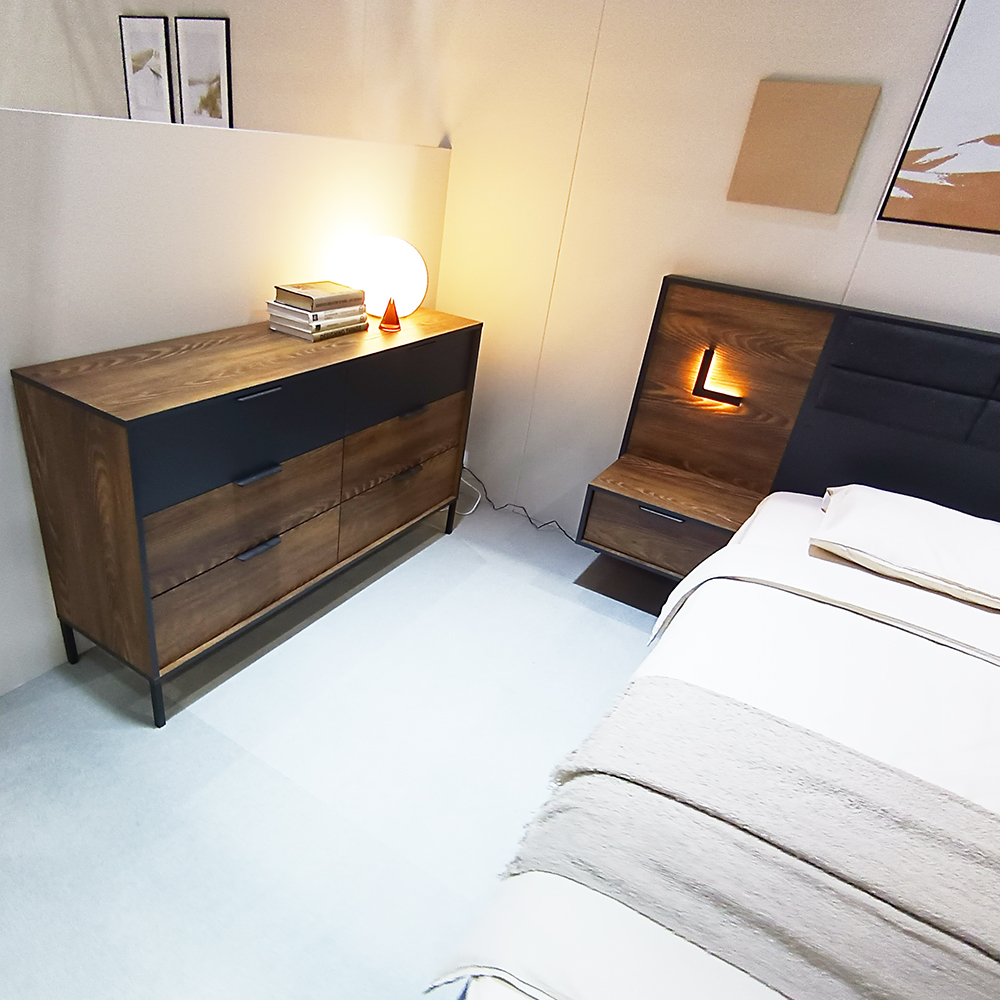 Korpus nábytku je vyroben z kvalitní laminátové dřevotřísky s ochrannou ABS hranou. U komody jsou vysoké, kovové nožičky v černém odstínu. Zásuvky jsou opatřeny ložiskovými pojezdy s tichým dovíráním pro hladký posun. Záda a dna zásuvek zpevňují HDF desky s omyvatelnou vnitřní stranou.
