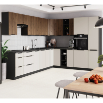 Vše je umocněno černými kovovými úchyty, které přidávají na eleganci a zároveň zajišťují vysokou uživatelskou přívětivost. Materiál kuchyně, kvalitní laminátová dřevotříska, zaručuje dlouhodobou odolnost a snadnou údržbu. Dvířka jsou navíc opatřena ochrannou ABS hranou. Zásuvky typu PREMIUM BOX s tichým dovíráním a kovovými bočnicemi přinášejí špičkový uživatelský komfort. Tichým dovíráním jsou opatřeny i veškeré panty u dvířek.
