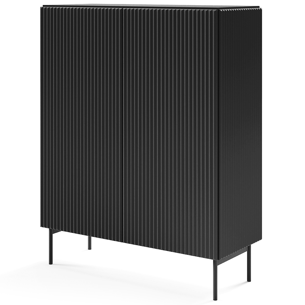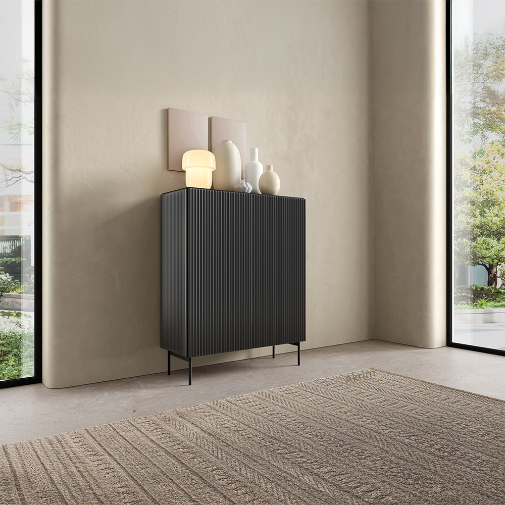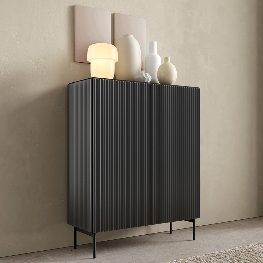 Černá barva, drážkovaná dvířka a boky a maximálně čistý vzhled bez úchytek. Kolekce MUTI přináší do obýváku nadčasový styl a pořádek v každodenních věcech. Díky široké nabídce dílů snadno poskládáte TV zónu a úložné prostory v obývacím pokoji.